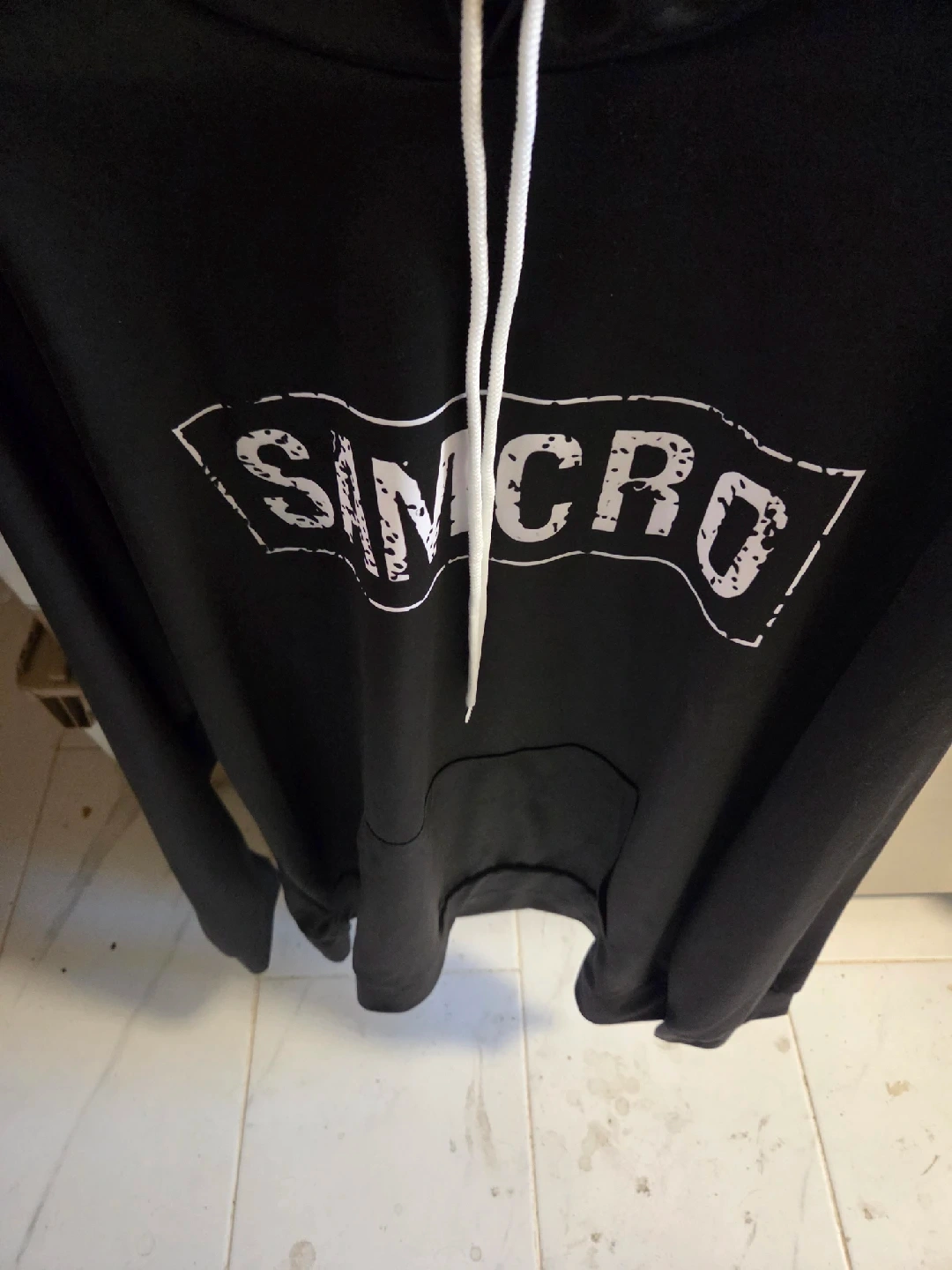 Selling a black hoodie with a Sons of Anarchy design on the back. It also has 'SIMCRO' printed on the front. Perfect for fans of the show or anyone looking for a cool hoodie!