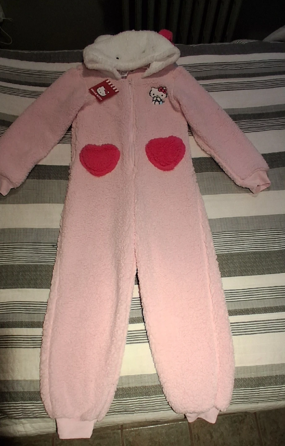 Super cute Hello Kitty onesie in a size M/M (10/12)! It's a soft, fuzzy pink with a Hello Kitty hood and sweet heart pockets. Perfect for lounging around the house or for a fun costume party