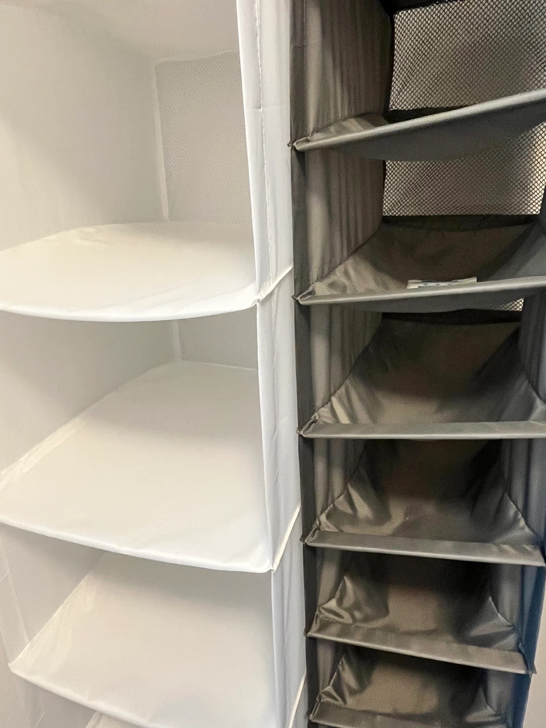 Declutter your closet with this handy hanging organizer! It features both white and grey compartments, perfect for keeping your clothes, shoes, or accessories neatly stored and easily accessible. Great for maximizing space in smaller closets!