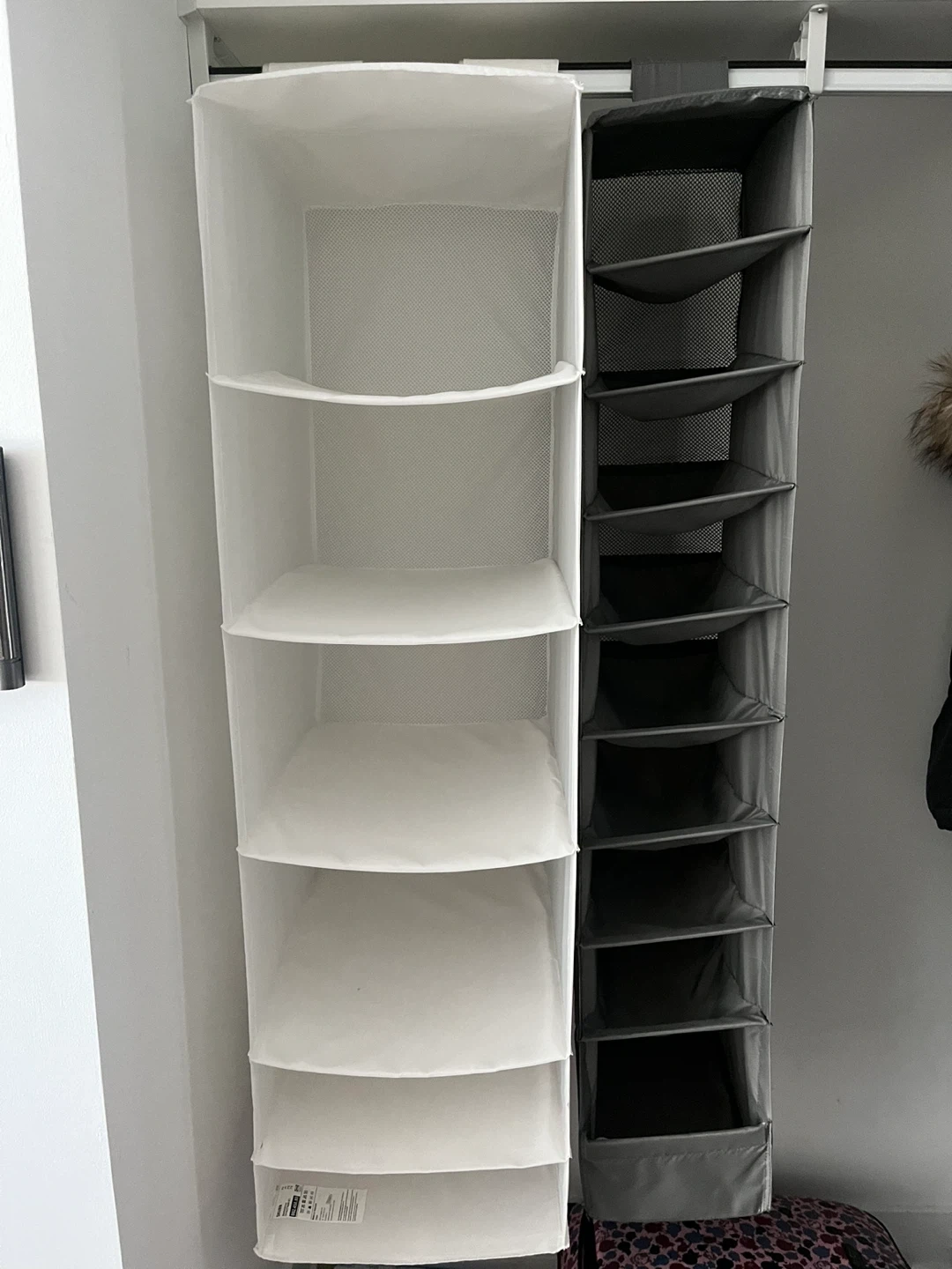 Declutter your closet with this handy hanging organizer! It features both white and grey compartments, perfect for keeping your clothes, shoes, or accessories neatly stored and easily accessible. Great for maximizing space in smaller closets!