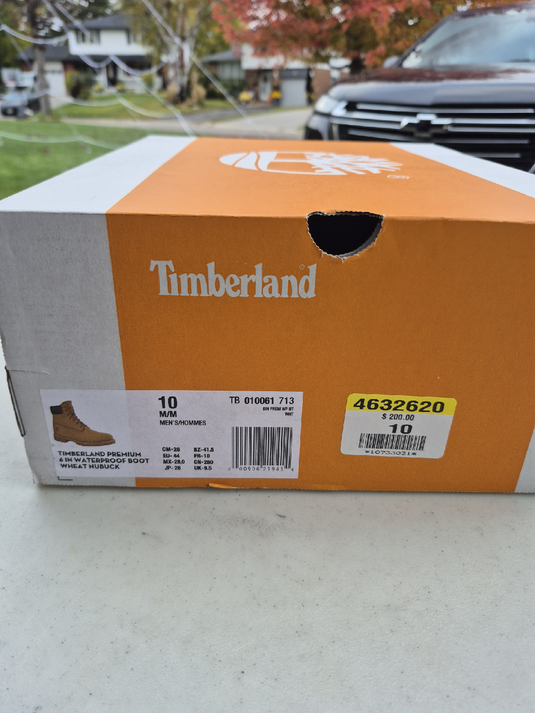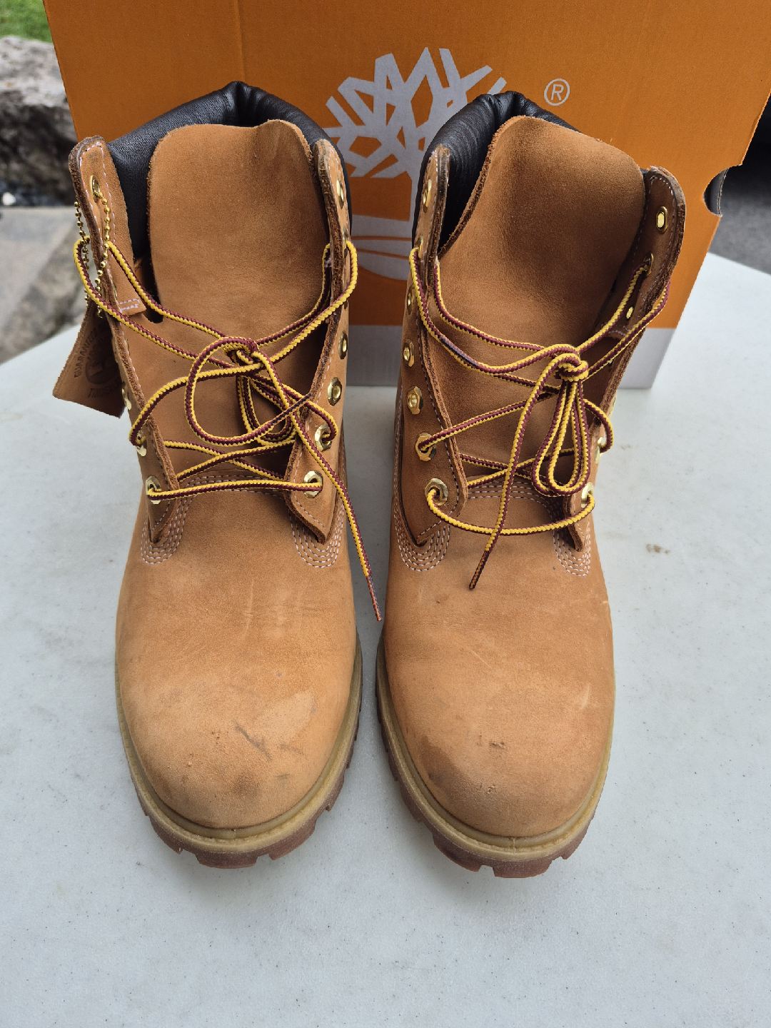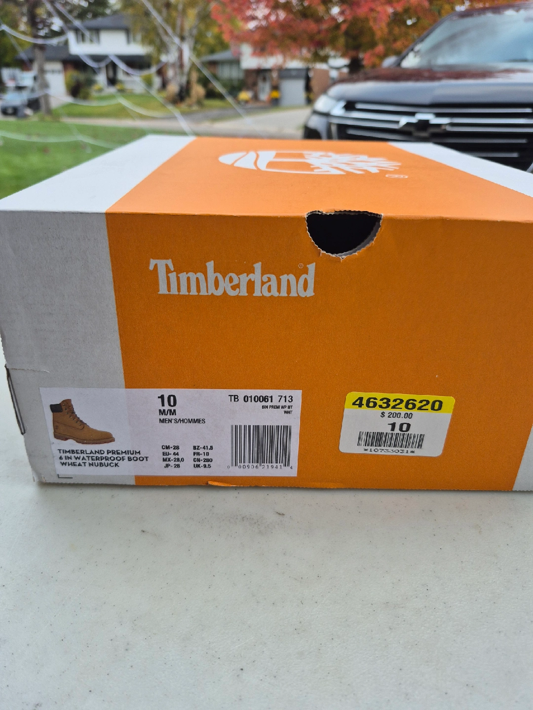 Selling a pair of Timberland Premium 4 1/2 Wheat Nubuck Boots in men's size 10. These classic boots are in good condition and come with the original box. The box shows that they were originally bought for $200. A great addition to your wardrobe!