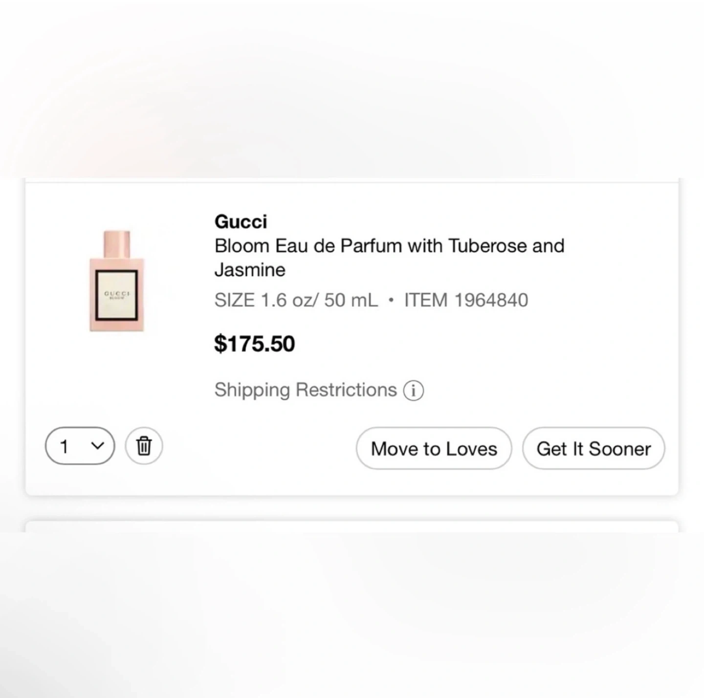 Buy & SellGucci Bloom EDP Perfume ($197.75 Retail)Gucci Bloom EDP Perfume ($197.75 Retail)$95Sprayed 4 to 5 times, full bottle, but doesn’t come with box. 50 mL bottle. Retails for $175+ tax ($197.75) AuthenticConditionLike newBrandGucciWHERE TO MEETCheck LocationView MapSELLERverifiedElleOrchard55544 reviews0 chats·0 favorites·22 views
