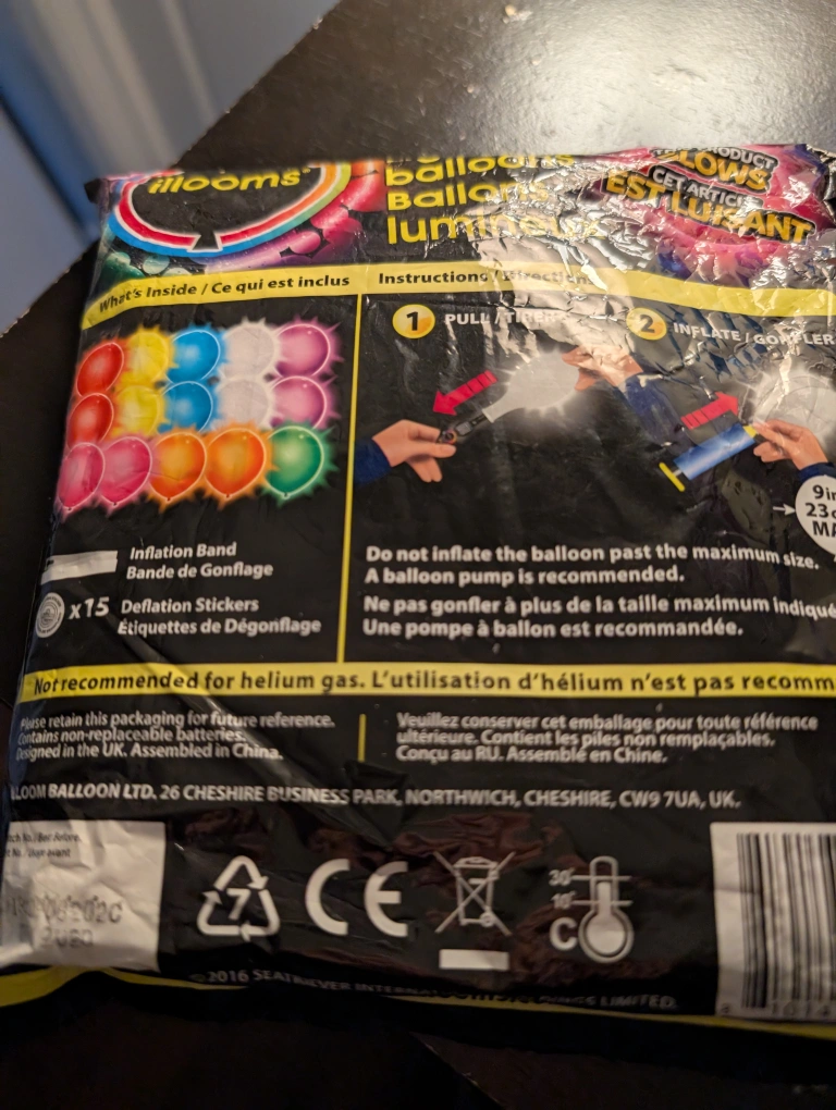 Selling a pack of Blooms Light Up Balloons. The package contains 15 balloons that light up, perfect for parties or events. They are new and come with inflation bands and deflation stickers. The balloons are designed to light up for up to 15 hours.