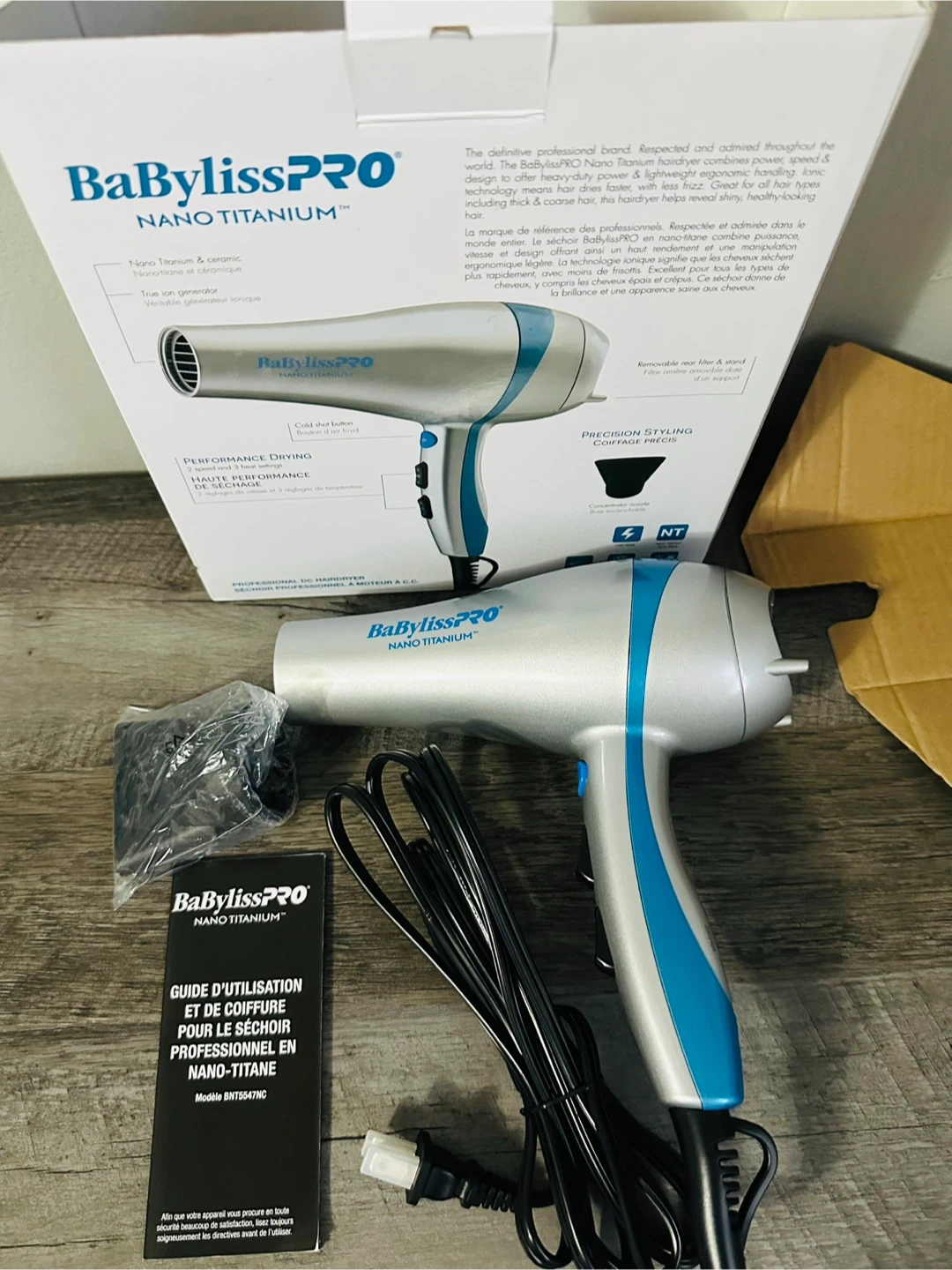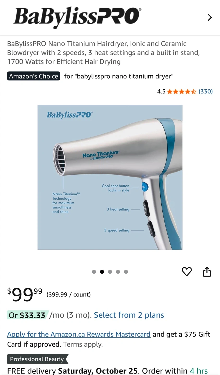 73Selling a BaBylissPRO Nano Titanium hair dryer! It has ionic and ceramic blow dryer with 2 speeds and 3 heat settings. It also has a built-in stand. Originally bought for $99.99 and comes with the box!