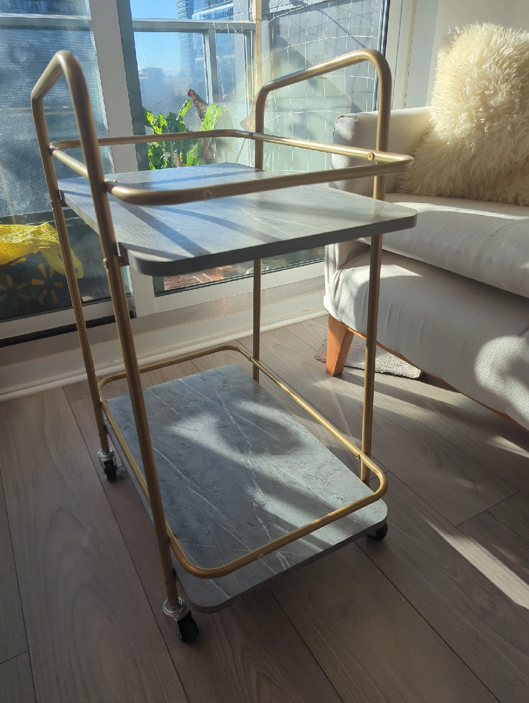 1000+2-tier open shelf provides you with ideal storage space for plenty of kitchen supplies. Additionally, supported by heavy-duty steel frame, the kitchen rolling cart is not easy to crack or shake. The curved handle is designed for pushing the cart conveniently. What's more, 4 smooth-rolling casters (2 of them are lockable) make it easier to move in your kitchen or dining room. Not only a kitchen storage cart, but also can be used as a bar serving cart or food cart, this utility cart is an ideal storage organizer for different places. Features: 2-tier open shelf provides ample space for kitchen essentials Durable MDF and solid steel frame promise longer service life Equipped with 4 rolling casters for flexible movement Ergonomic handle on each side for easy grip Suitable for kitchen, dining room, restaurant, bar, etc Specification: Color: Grey, Golden Material: Steel, MDF Overall Dimension: 16'' x 24'' x 32.5'' (L x W x H) Height from Each Shelf to Ground: 5'', 25'' Net Weight: 15 lbs Weight Capacity of Each Shelf: 22 lbs