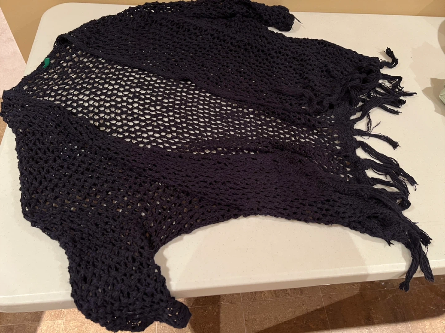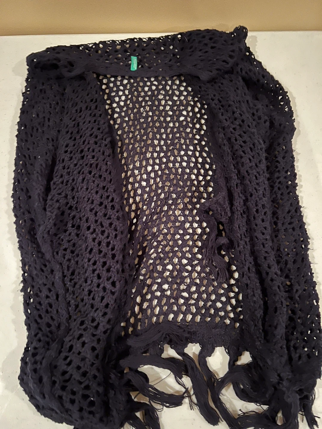 Cozy up with this United Colors of Benetton black knit cardigan! It features a unique open knit design and stylish fringe detailing. Perfect for layering on cooler days!