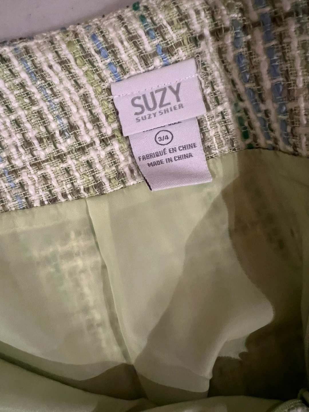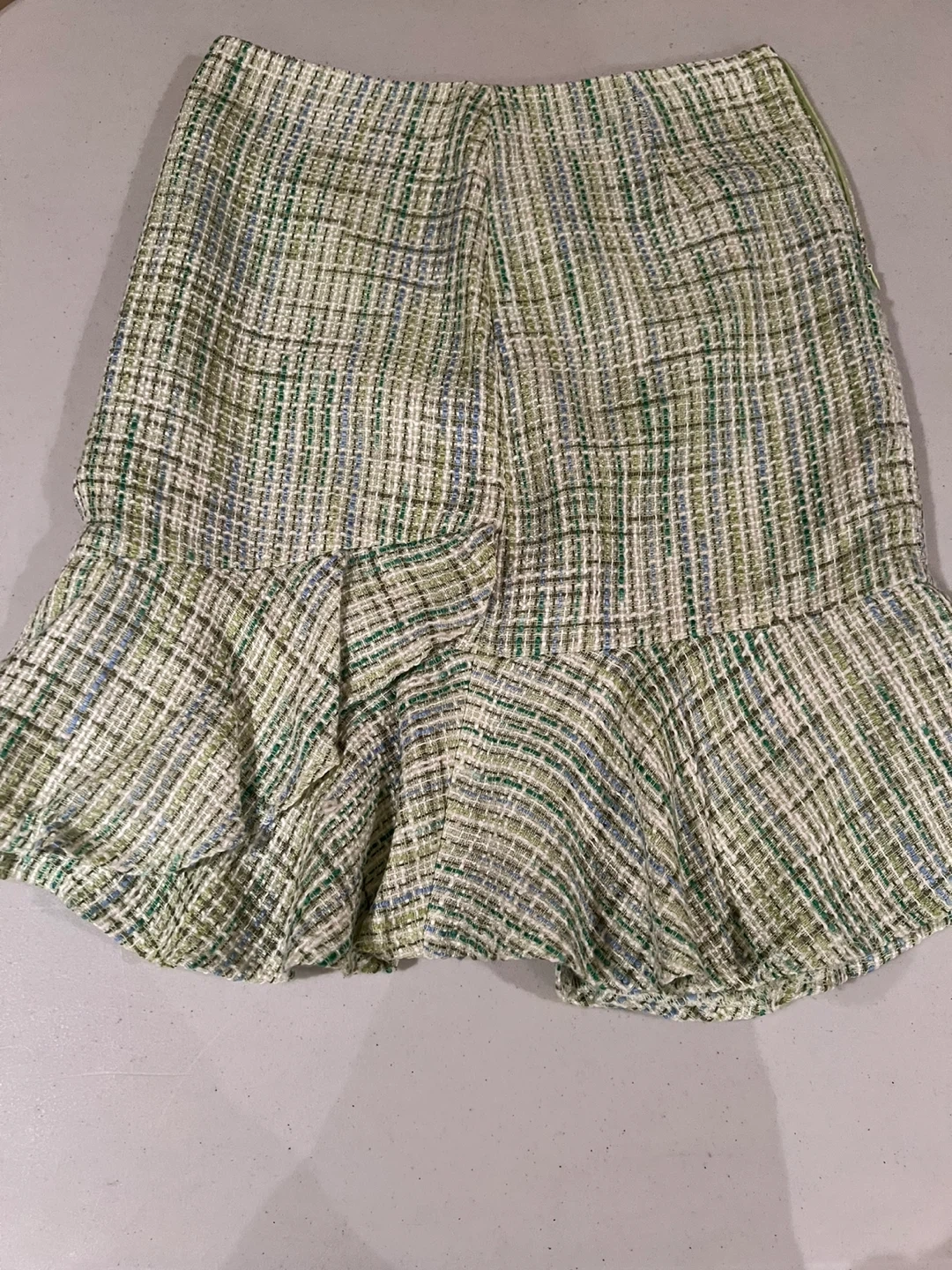 178Selling a cute Suzy Shier skirt in size 3/4. It features a lovely woven texture in shades of green, white, and blue. The skirt also has a ruffled hem, adding a touch of flair to the design worn once