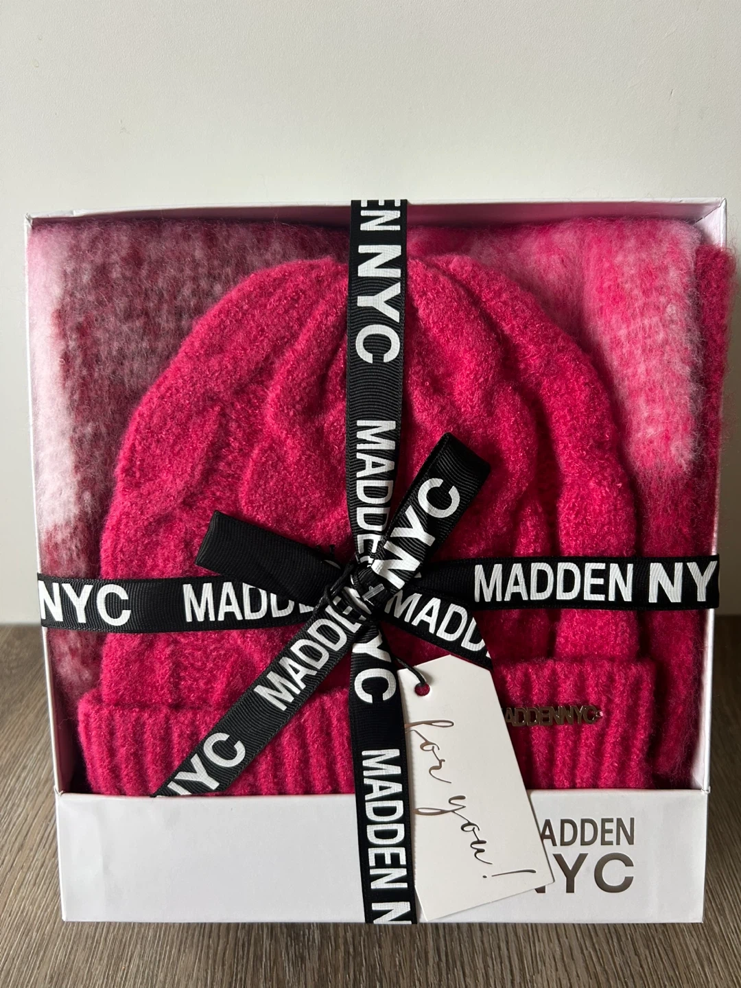 a brand new Madden NYC hat and scarf set! This cozy set includes a pink beanie and a matching plaid scarf, perfect for keeping warm this winter. Comes in the original box, making it a great gift option too!