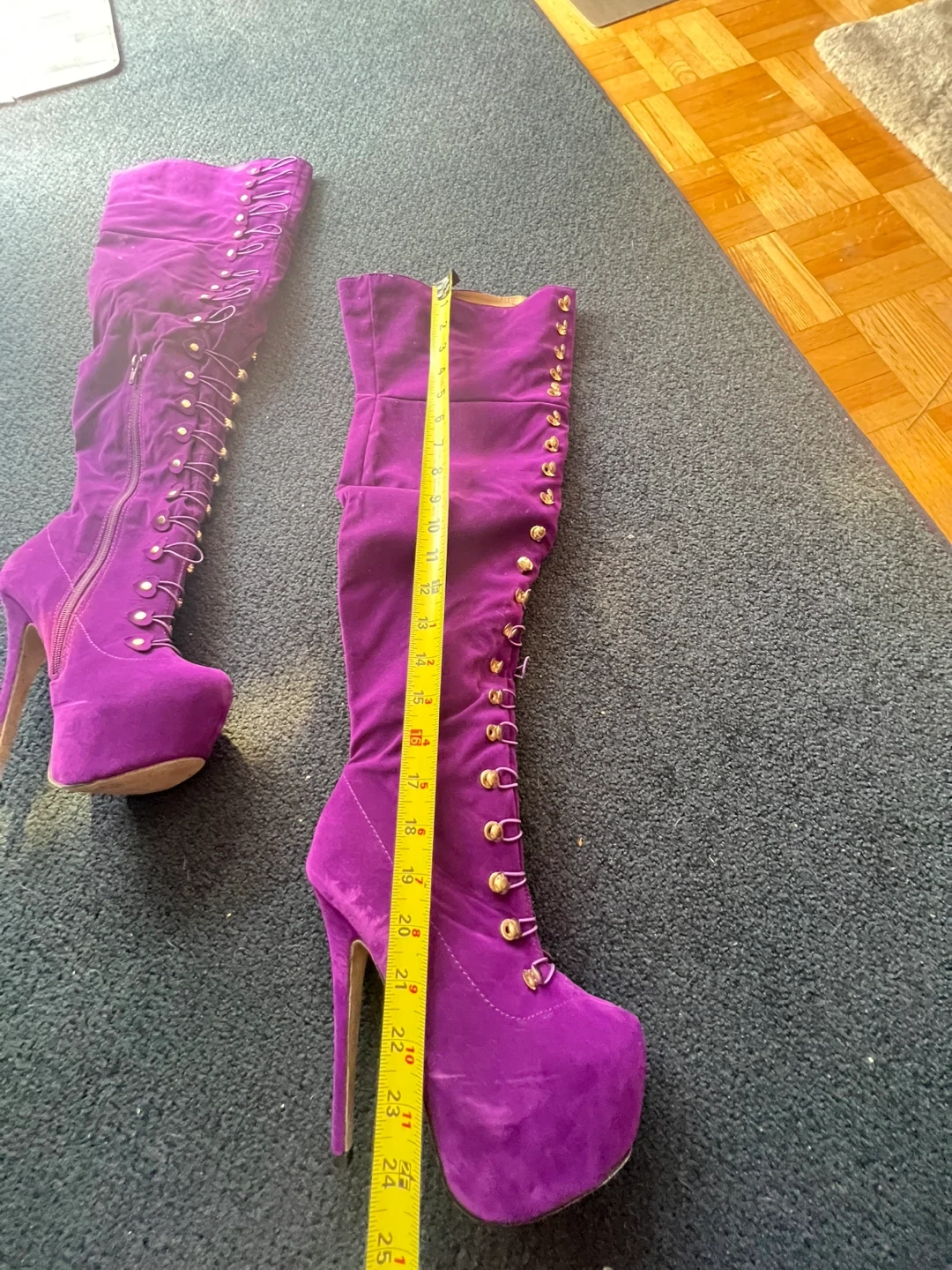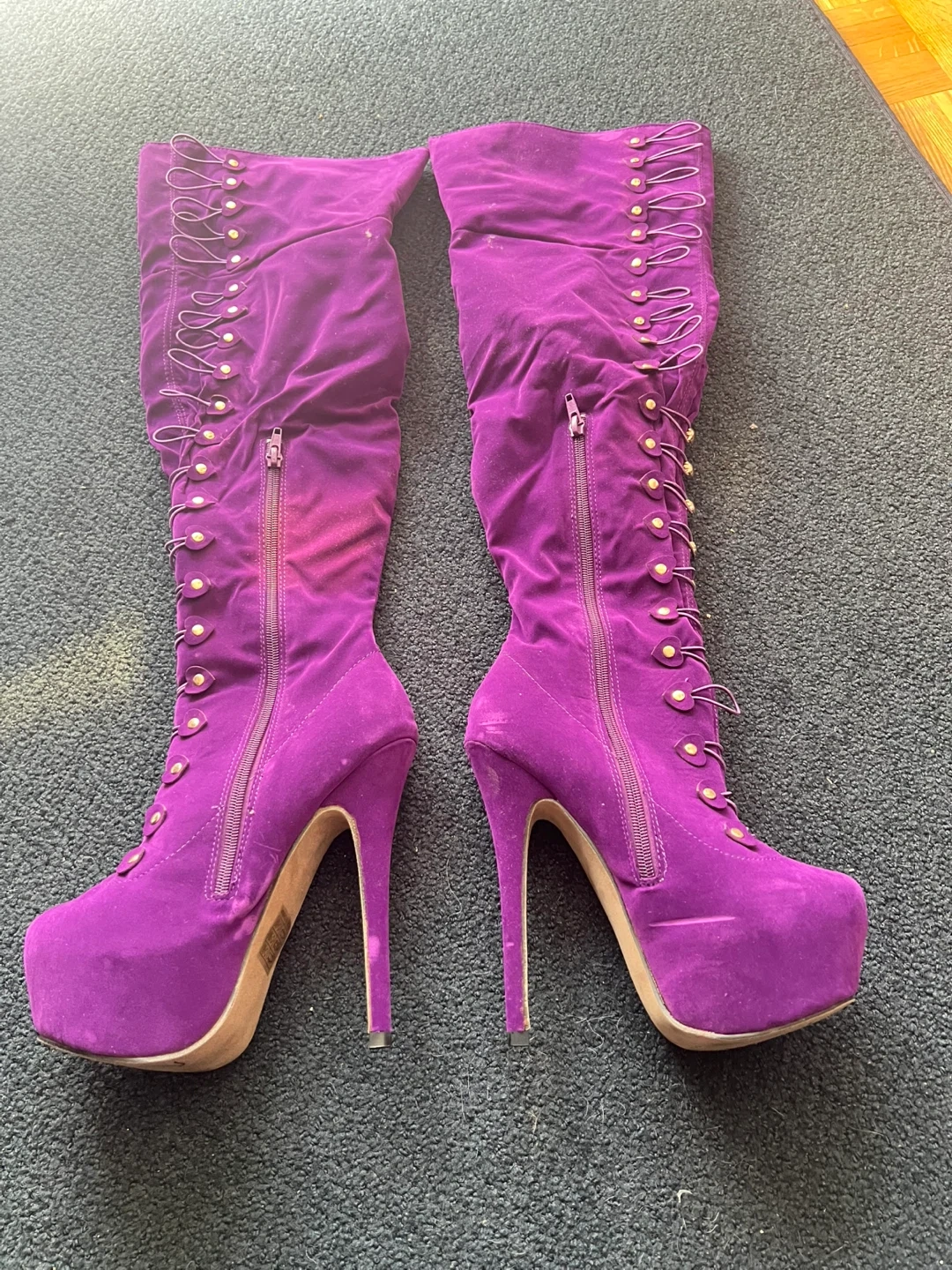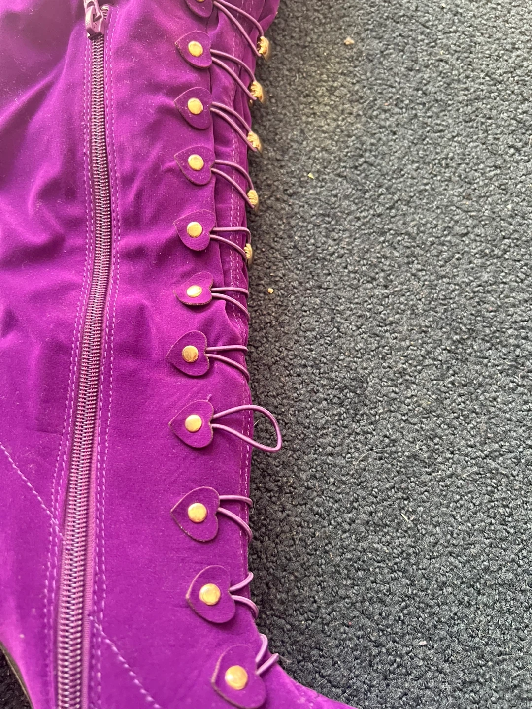 Selling a pair of eye-catching purple over-the-knee platform boots! They feature a unique design with gold-tone heart details and a side zipper for easy wear. These boots are sure to make a statement!