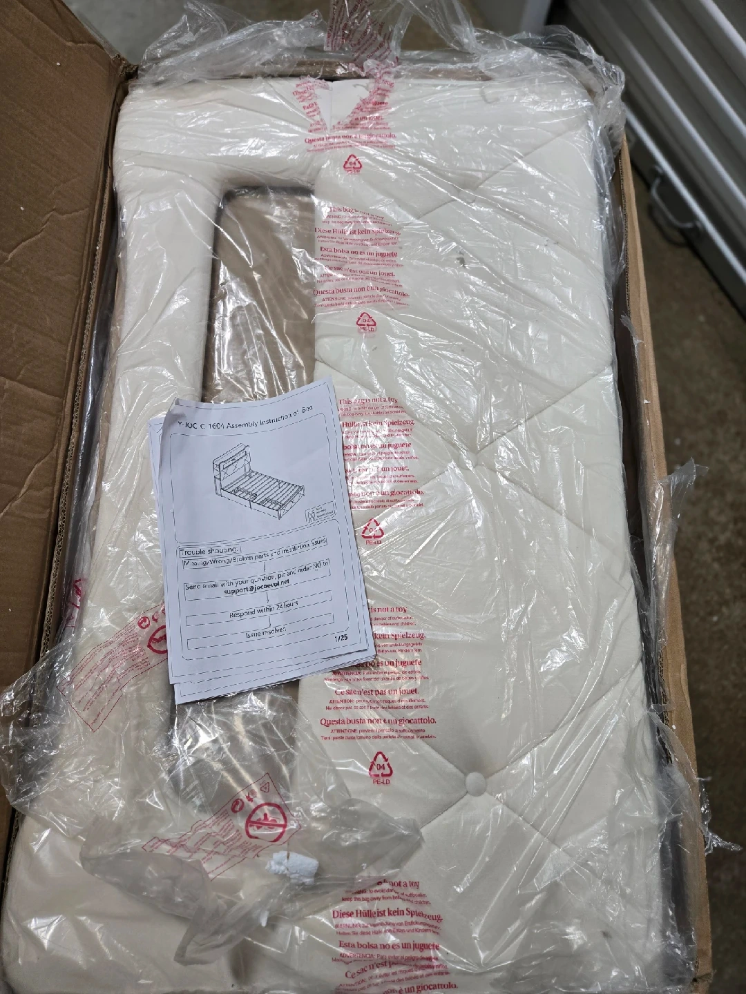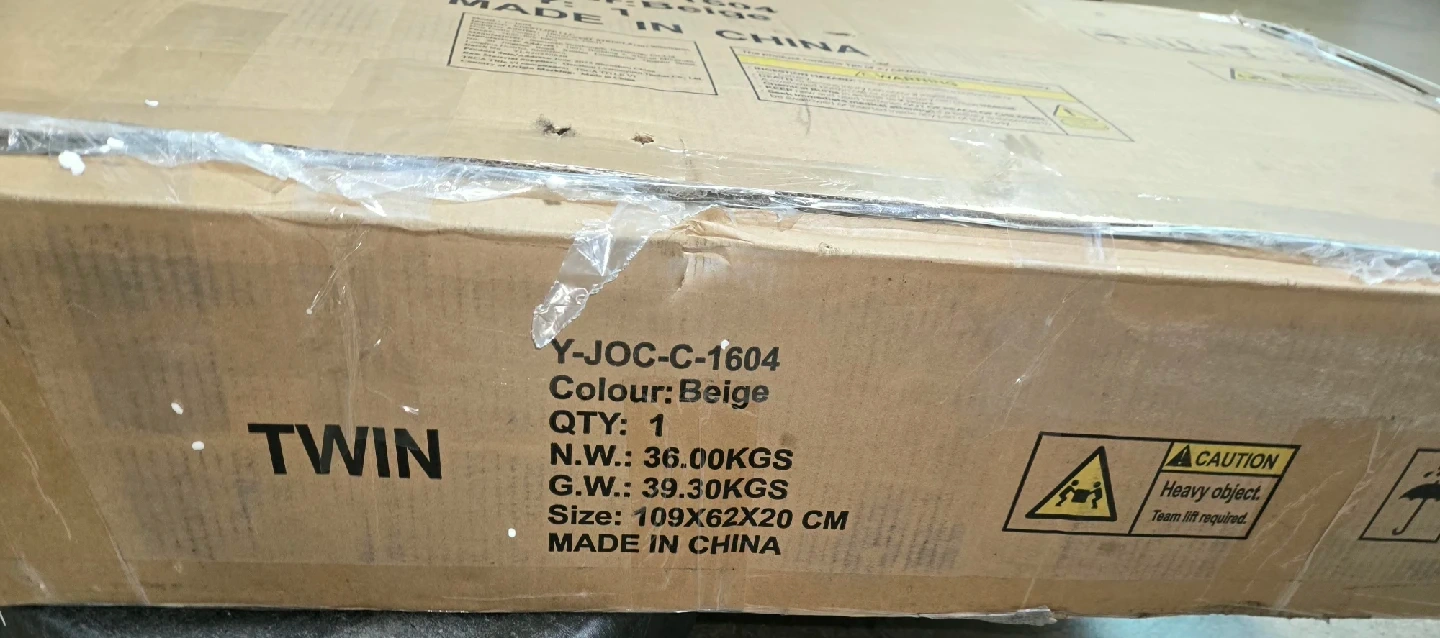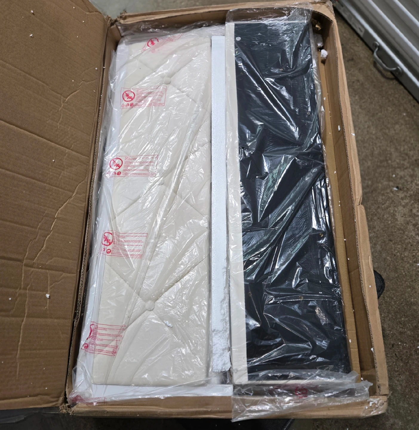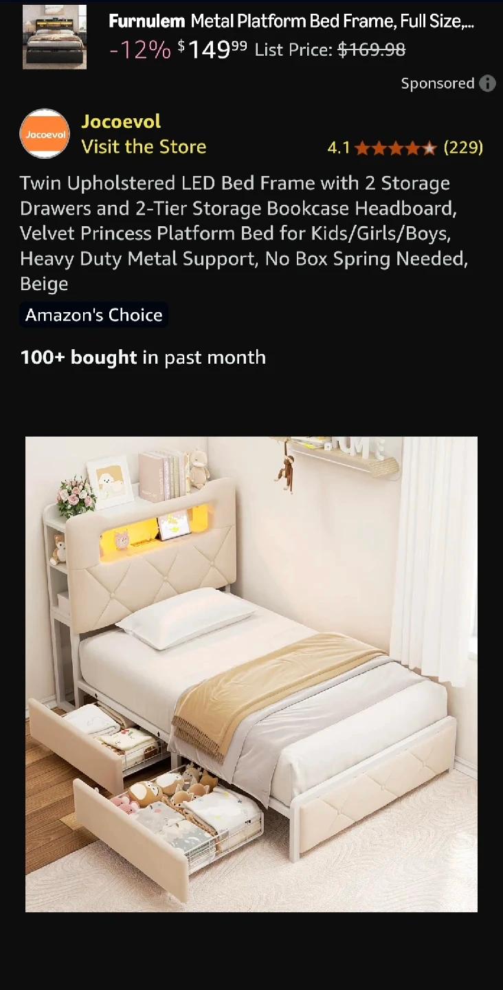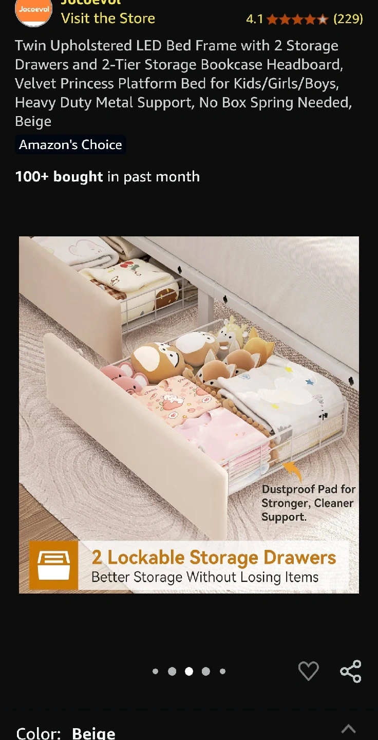 NOT NEGOTIABLE Selling a Jacoeval twin size upholstered LED bed frame in beige. It has two storage drawers and a 2-tier storage bookcase headboard. The dimensions are 84.7" x 40.9" x 45.7". The box is included!