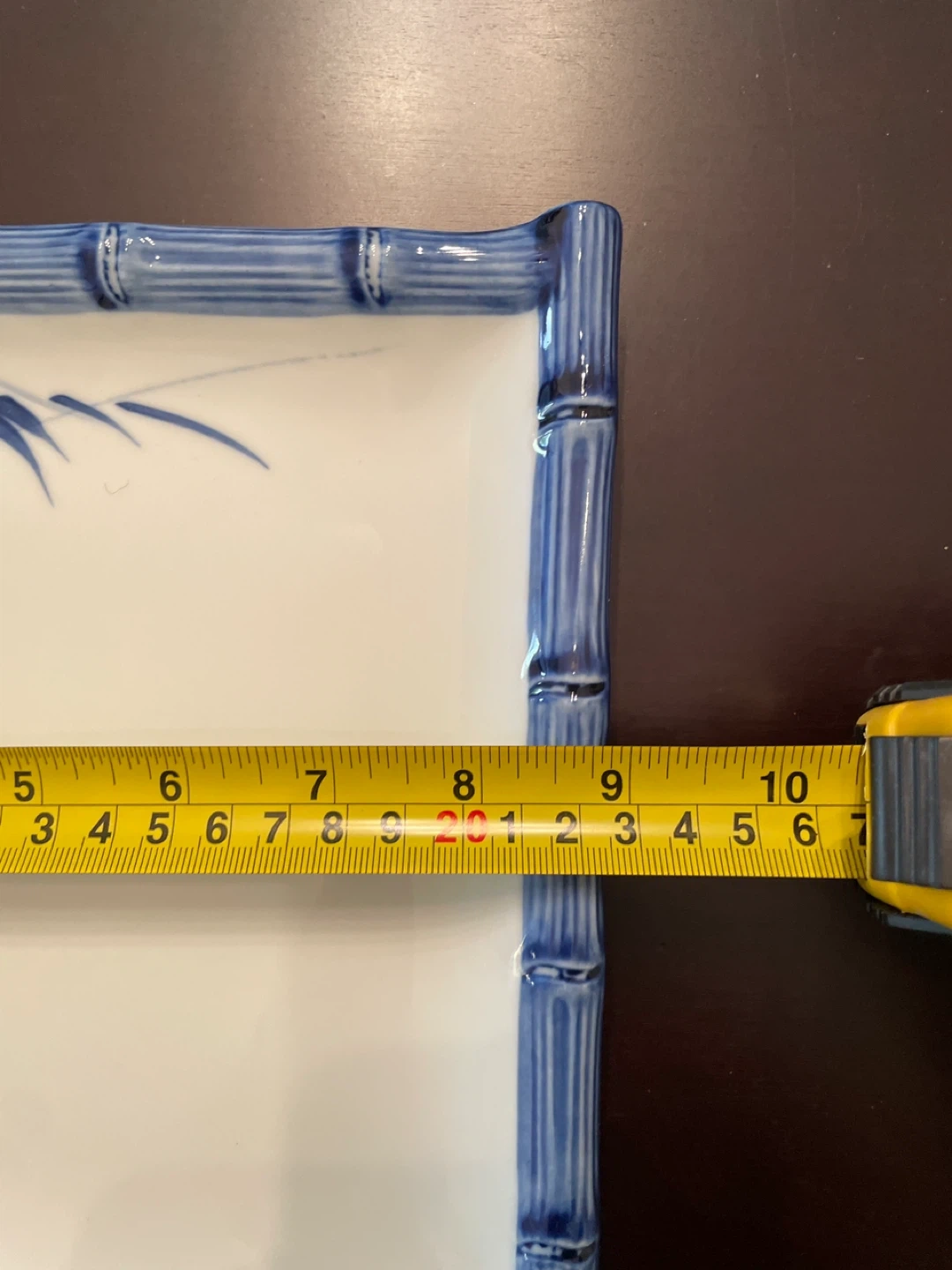 Selling a lovely square plate from TOYO, made in Japan! It has a unique bamboo design with blue accents. The plate measures approximately 8 inches by 8 inches, and is 1” high at edges.