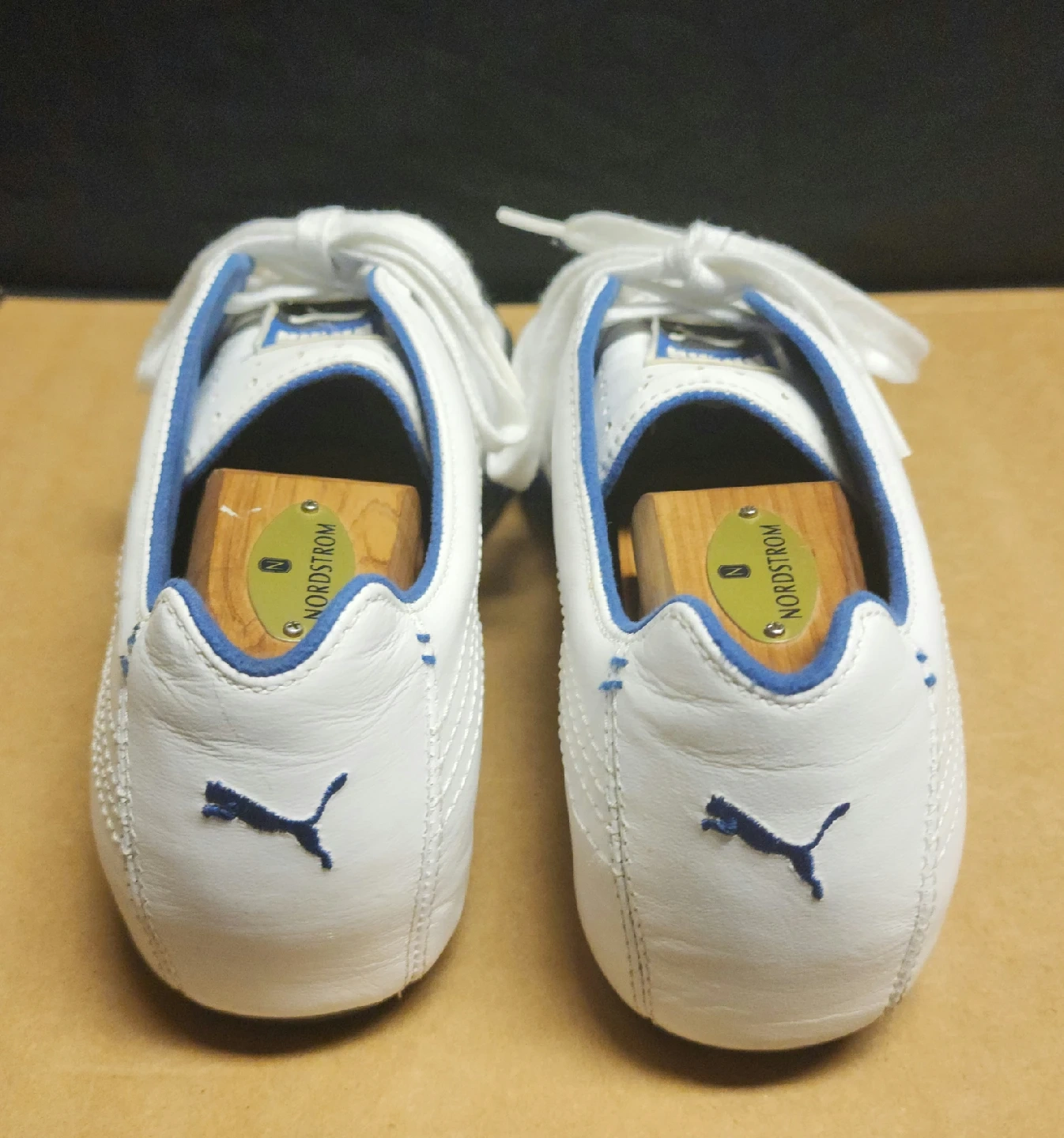 Selling a pair of Puma sneakers! They are white leather with blue accents. Great for casual wear or light sports activities. They are in great condition and ready for a new home Never worn