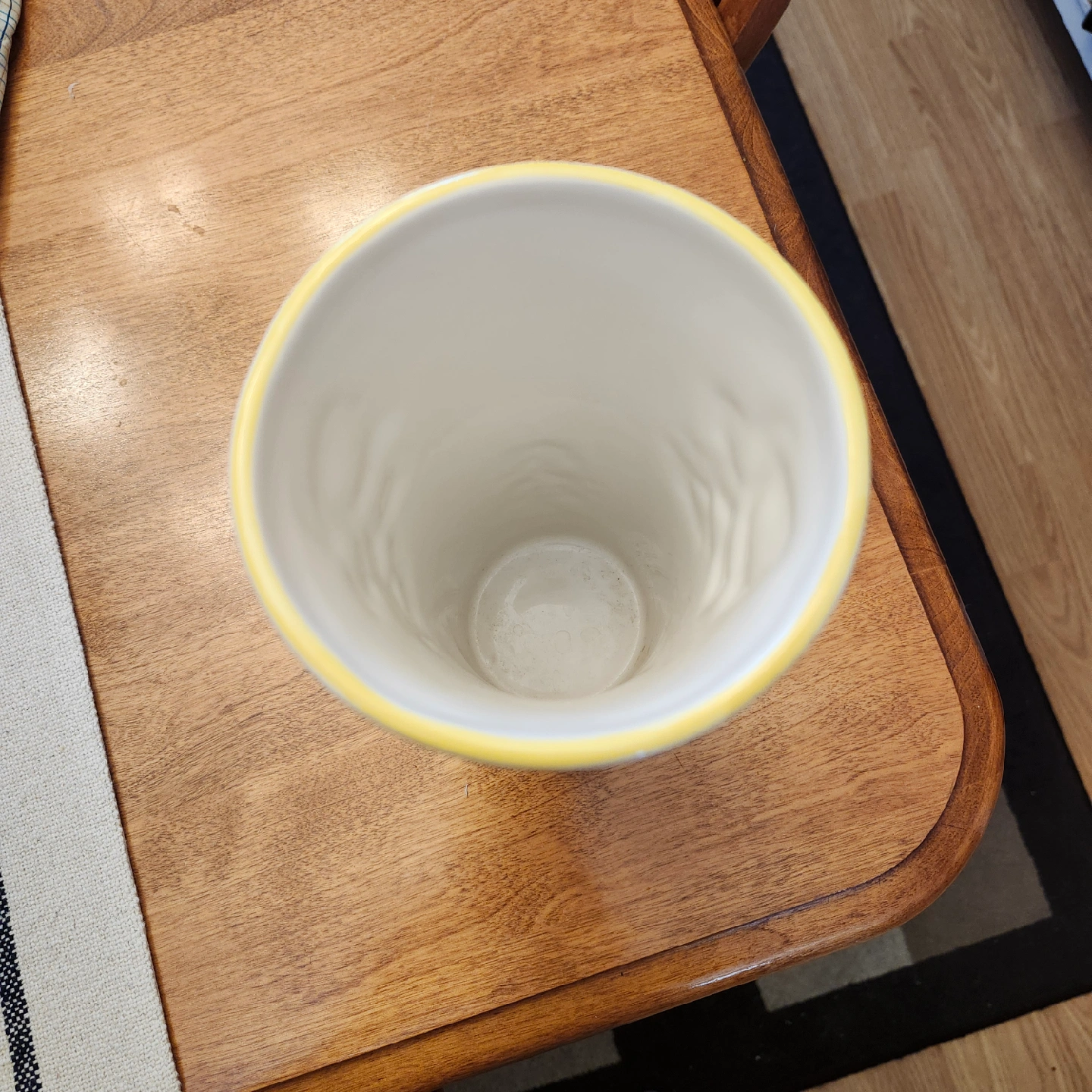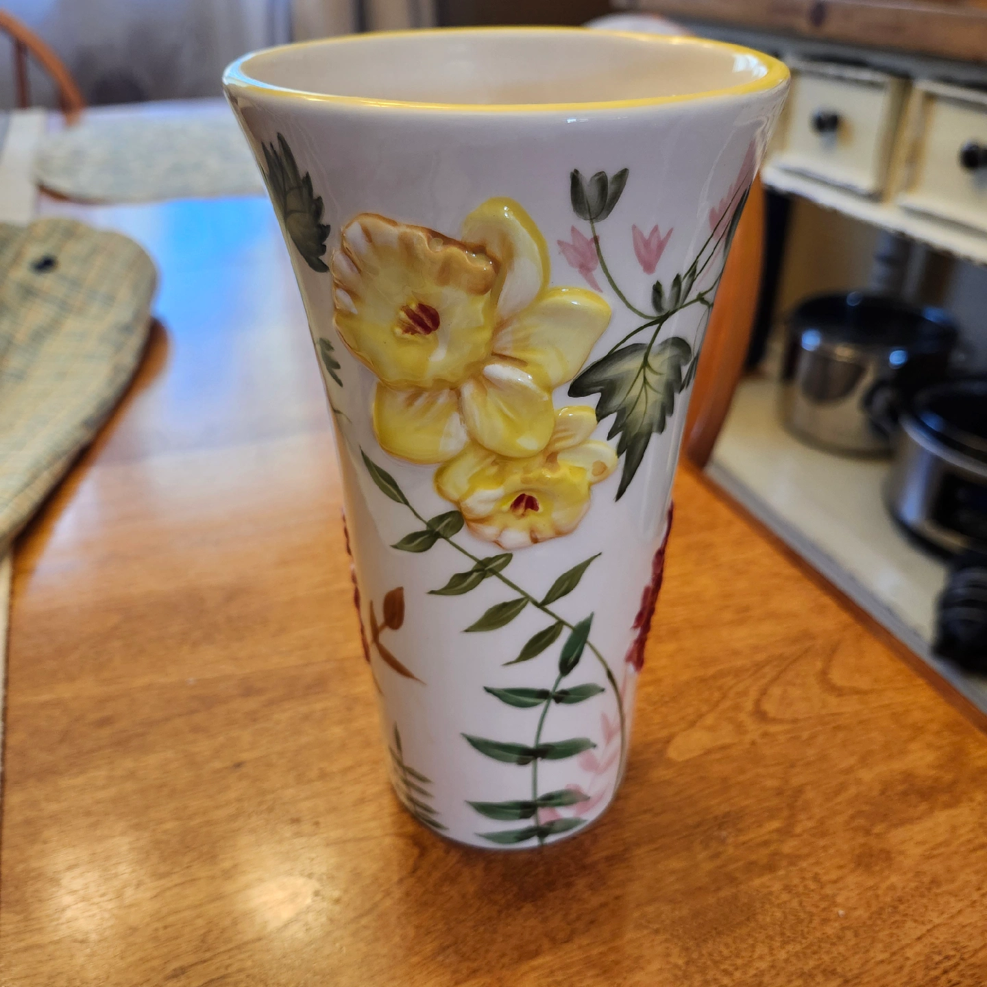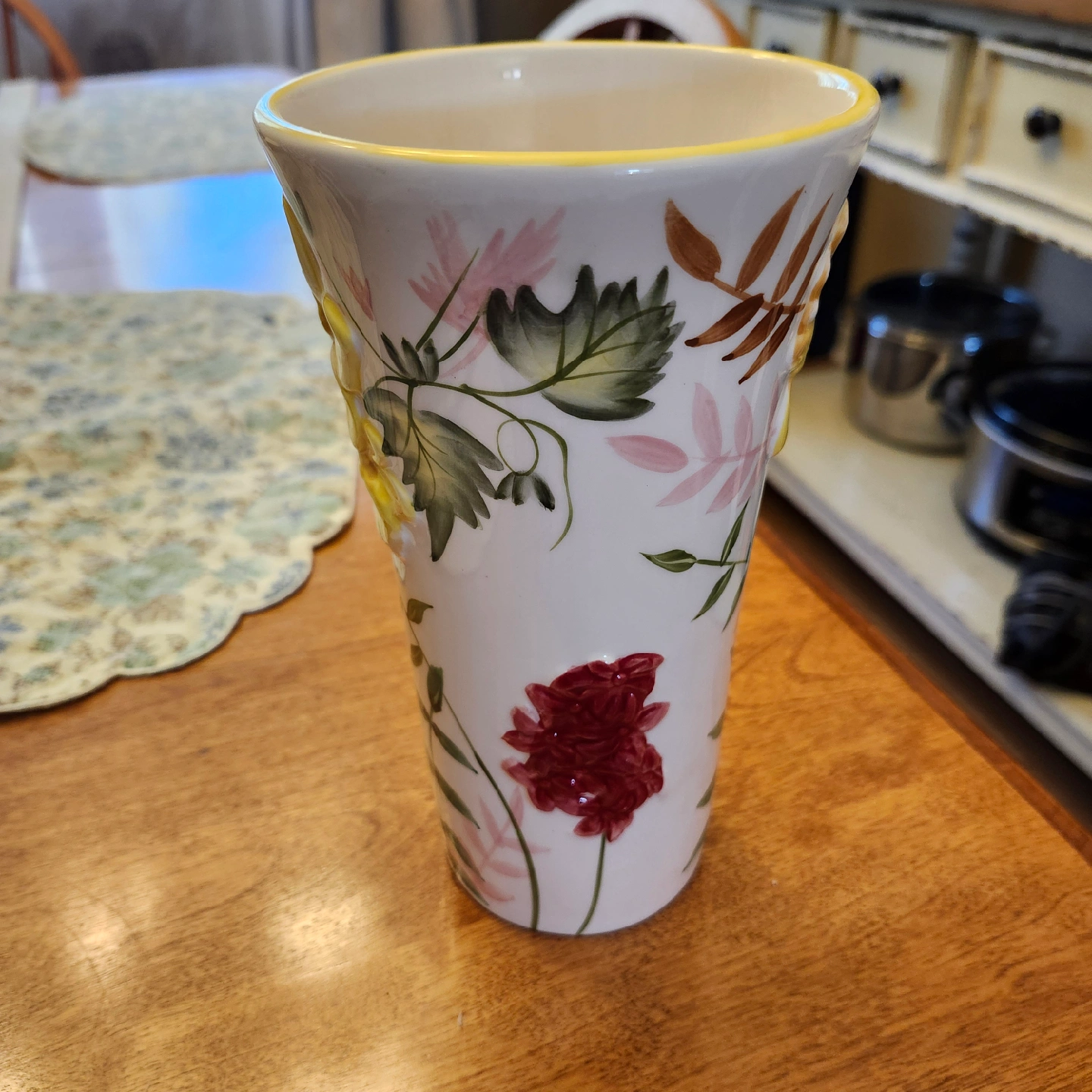 235A lovely floral vase, perfect for adding a touch flowers to your home. The vase features raised yellow daffodil and red flowers with green leaves on a white background. The rim is trimmed with a cheerful yellow colour, adding a bright accent to any room