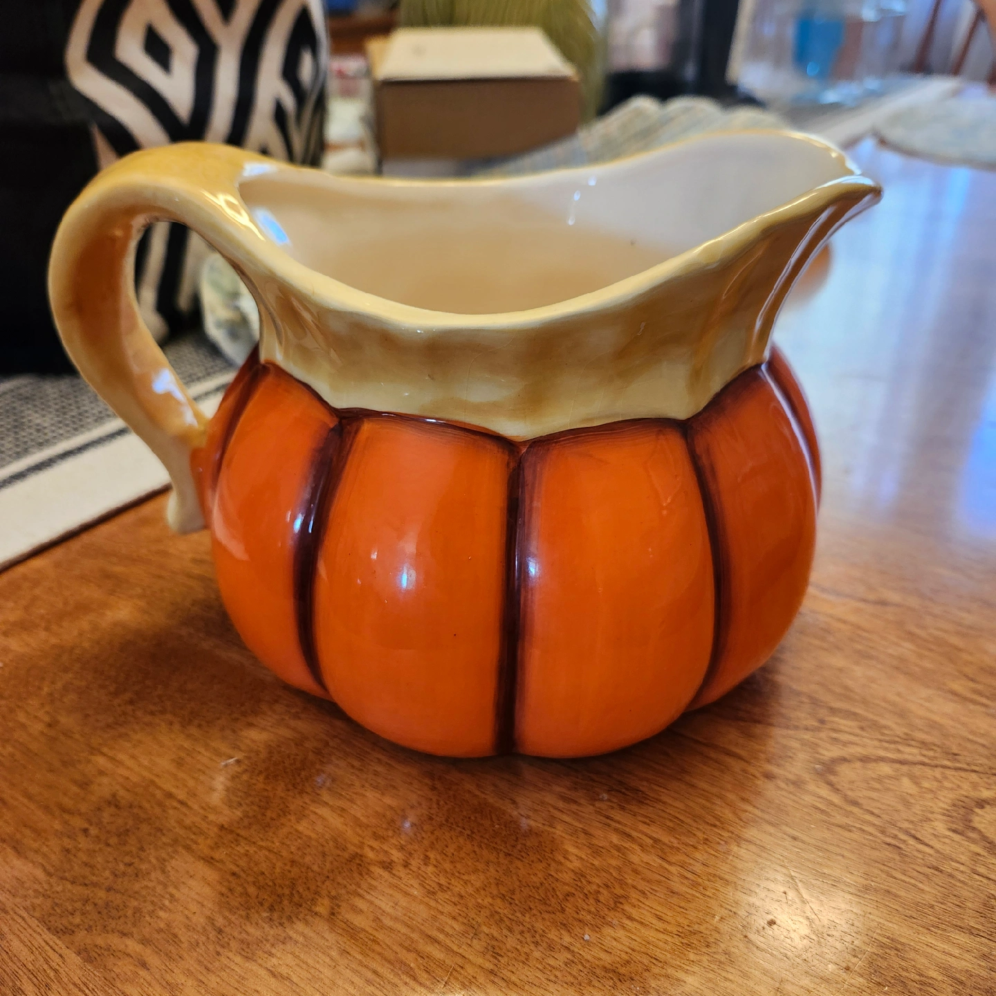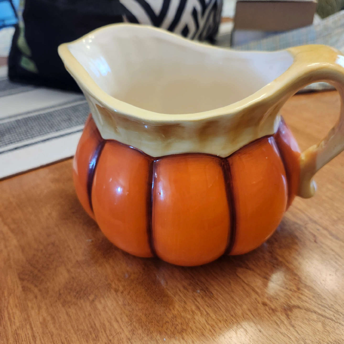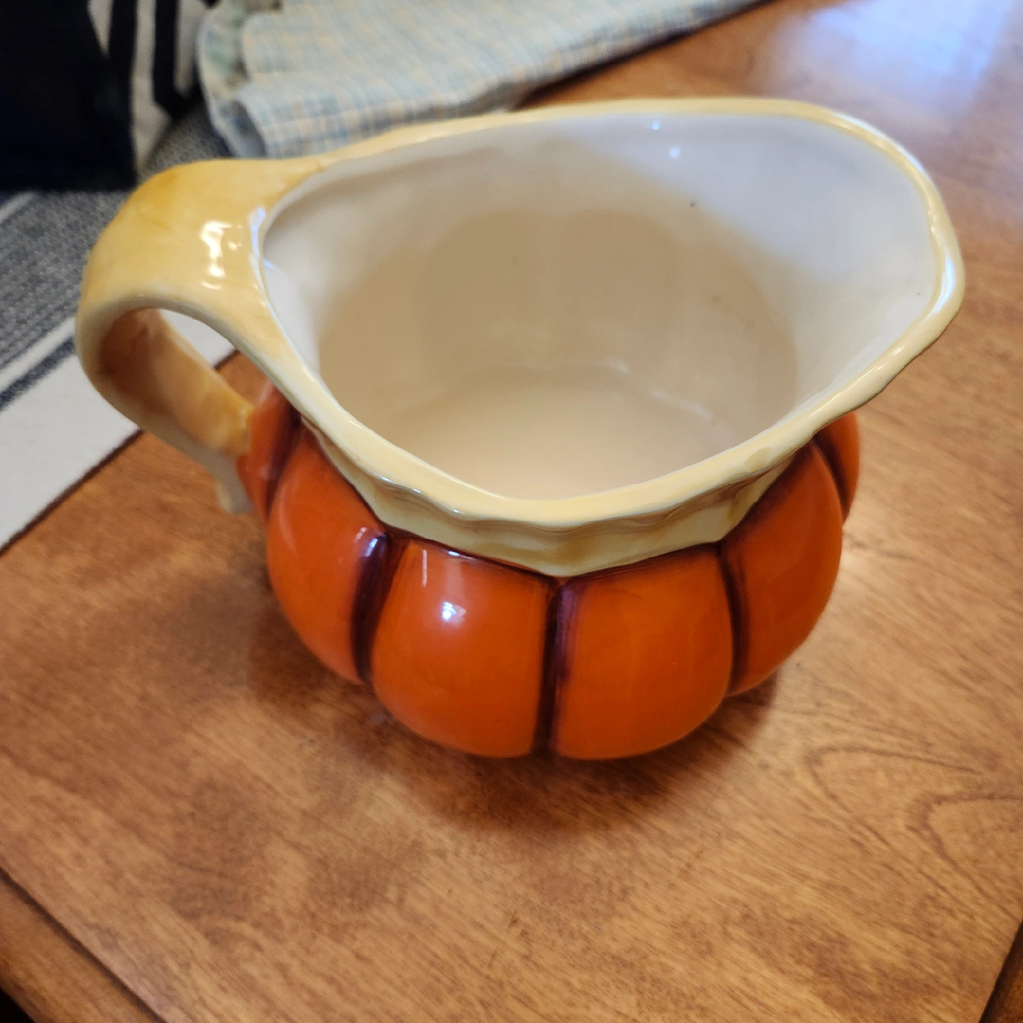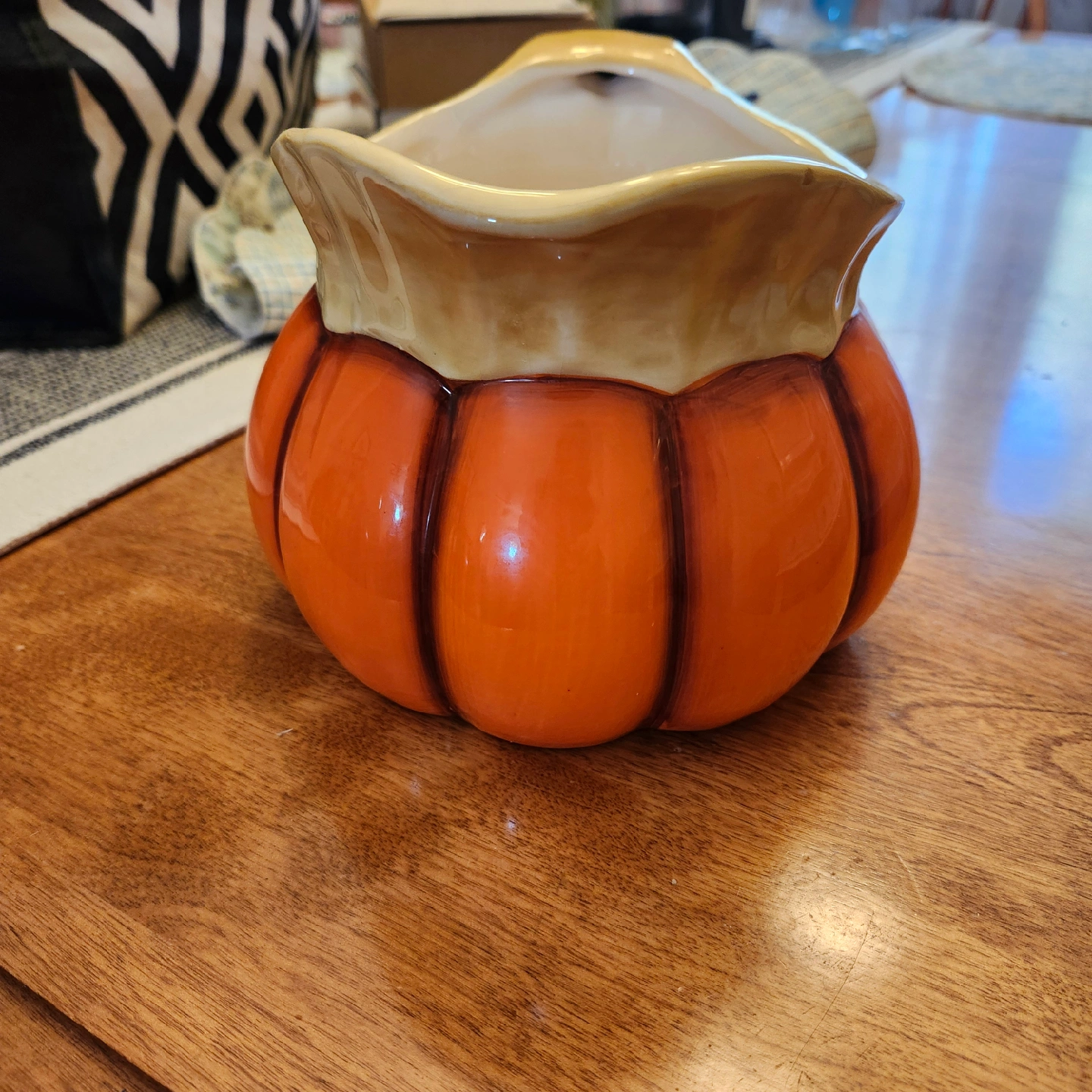 311This is a charming pumpkin-shaped gravy boat or flower pot. perfect for adding a touch of autumn to your table! It's in great condition.