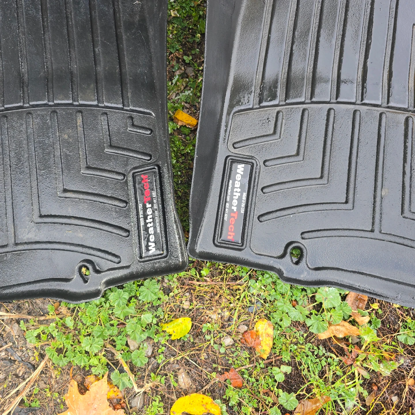 Selling a set of WeatherTech floor mats. They're black and in good condition. These mats are designed to protect your car's interior from dirt, mud, and snow. They have a custom fit and are easy to clean, making them perfect for all weather conditions