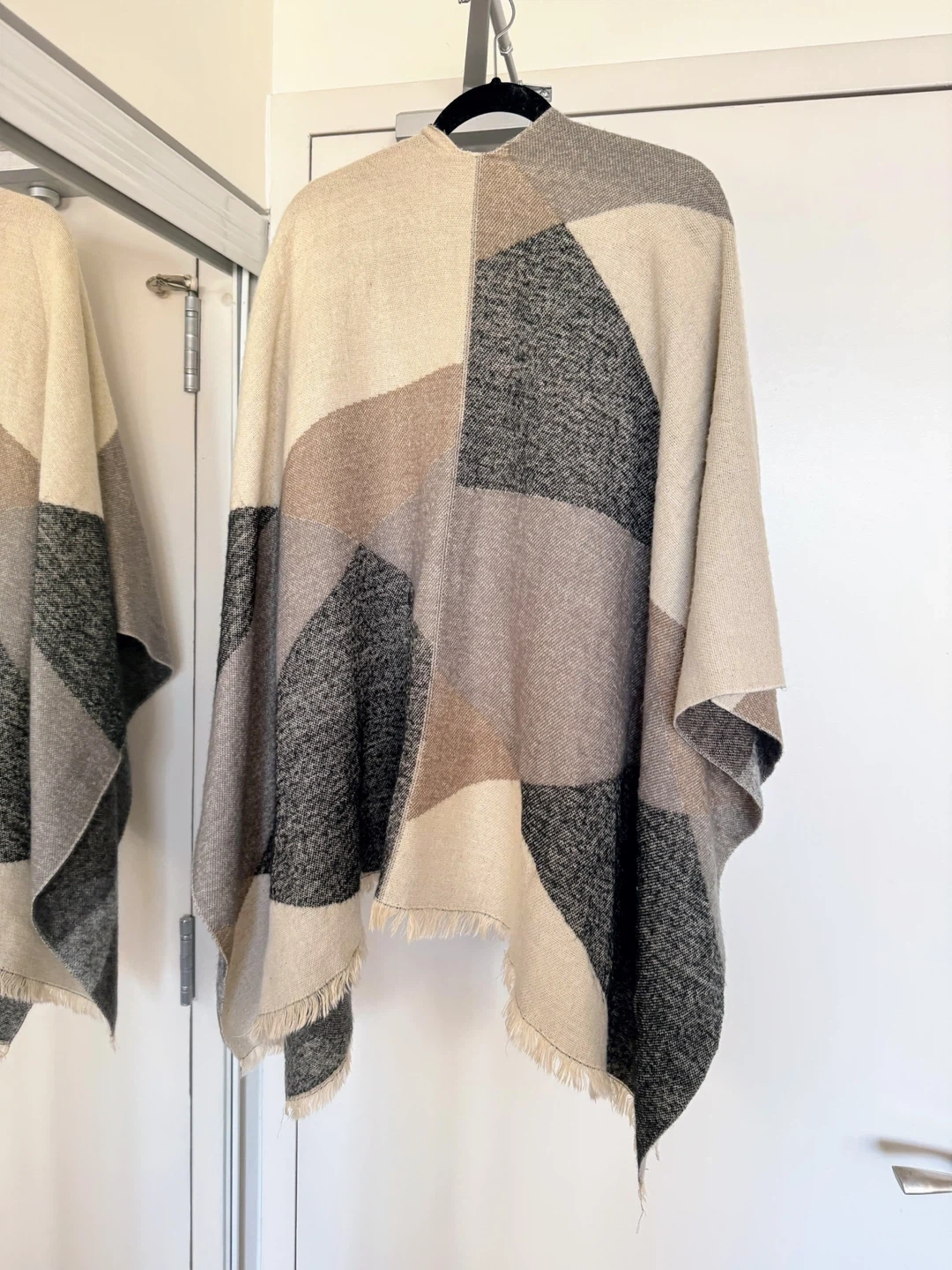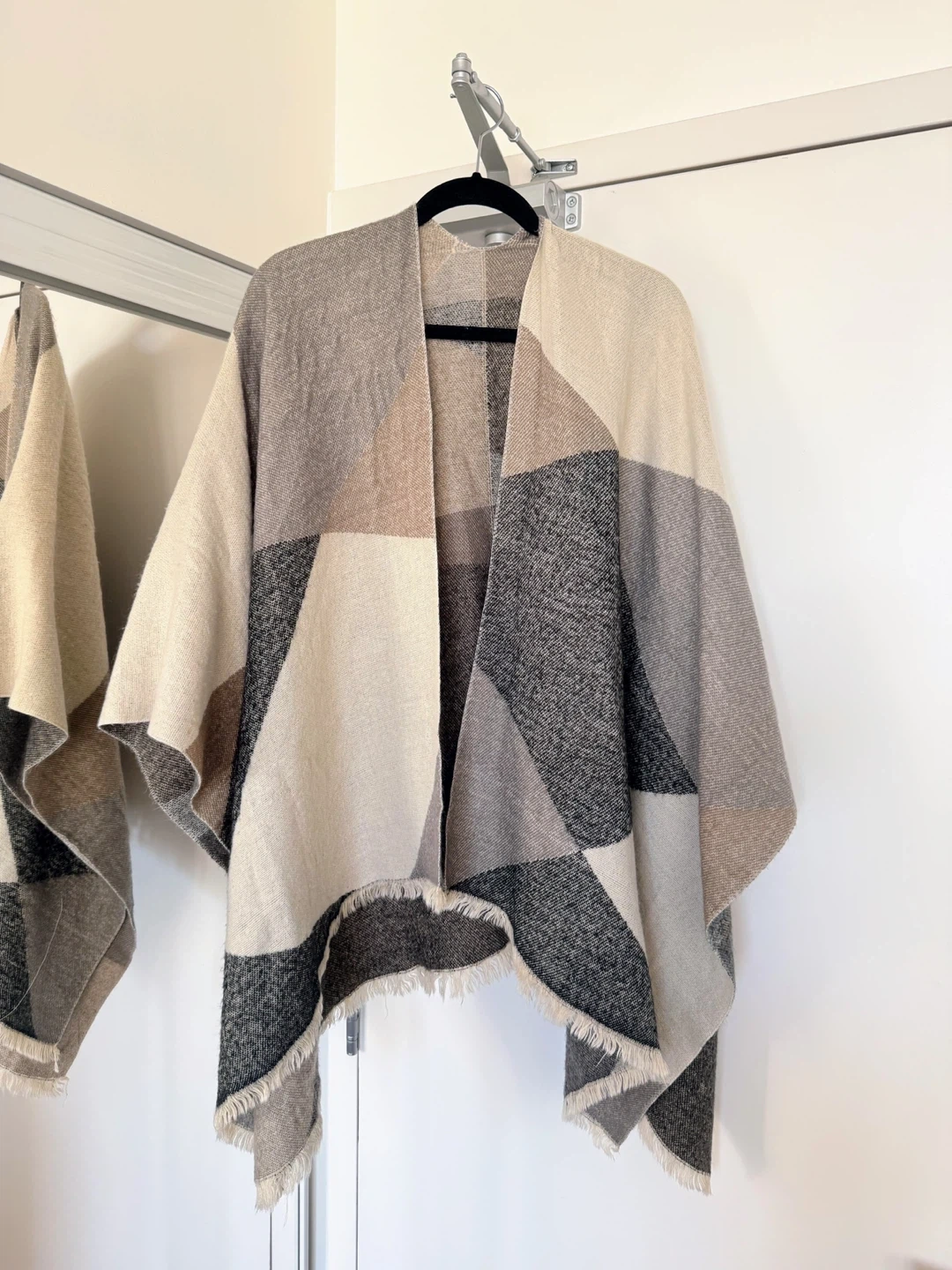 73Cozy poncho in beige, brown, and grey tones. Perfect for adding a stylish layer on cooler days. The material feels soft and comfortable, making it a great addition to your wardrobe. It's in great condition and ready for a new home!