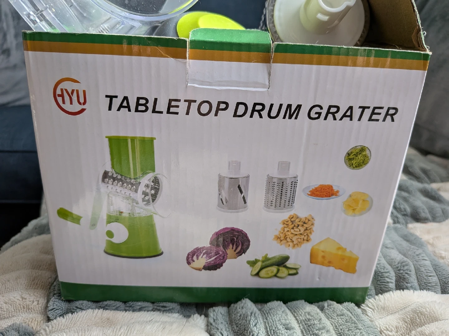Selling a brand new HYU Tabletop Drum Grater still in its original box! This grater is perfect for quickly grating vegetables, cheese, nuts, and more. It's easy to use and clean, making meal prep a breeze