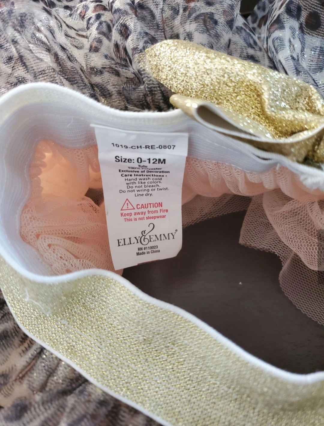 Adorable Elly & Emmy tutu set for your little one! This set includes a tutu, headband, and matching barefoot sandals. Perfect for babies aged 0-12 months. The tutu features a cute leopard print and a gold bow, making it a stylish outfit for photoshoots or special occasions
