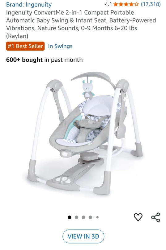 Selling an Ingenuity ConvertMe 2-in-1 Compact Portable Automatic Baby Swing & Infant Seat. It's battery-powered and features vibrations and nature sounds. My 7 month old only used it twice when she was born . She didnt like it so we never used it. Im only getting rid of it because im moving.