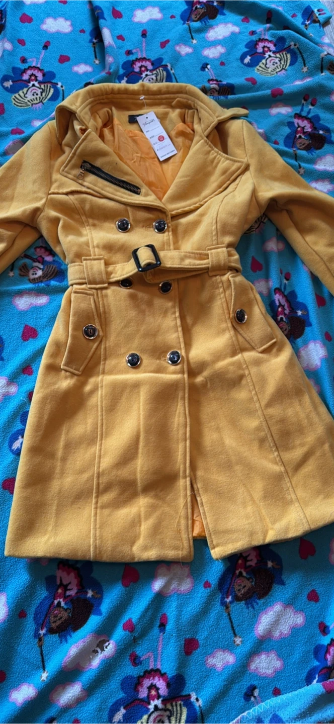 10This is a brand new, never-worn yellow trench coat! It's a size medium and features a stylish belted design. The material is a wool blend, perfect for keeping you warm and looking fashionable. It's a beautiful coat that would be a great addition to any wardrobe