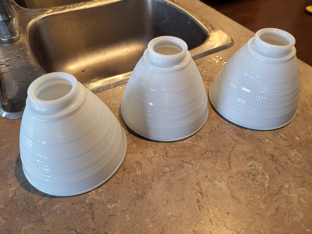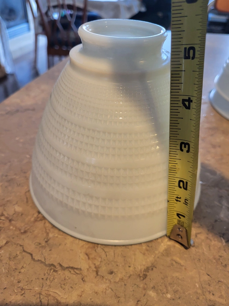 193Selling a set of three white glass light fixture shades. They're in great shape and ready to brighten up your space! Measurements: - Height: Approximately 5 inches - Bottom Diameter: Approximately 6 inches - Top Diameter: Approximately 2 inches