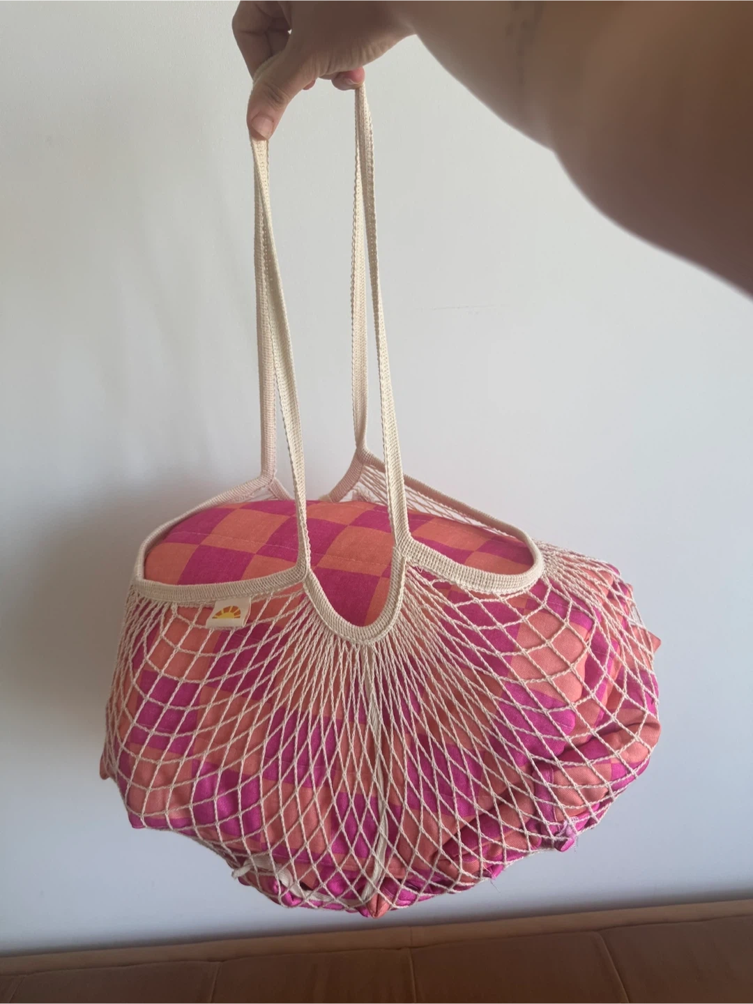 Selling a super cute checkerboard picnic blanket in shades of pink and orange! It's perfect for picnics, beach days, or just lounging in the park. The blanket is in great condition and comes in a handy net bag for easy carrying