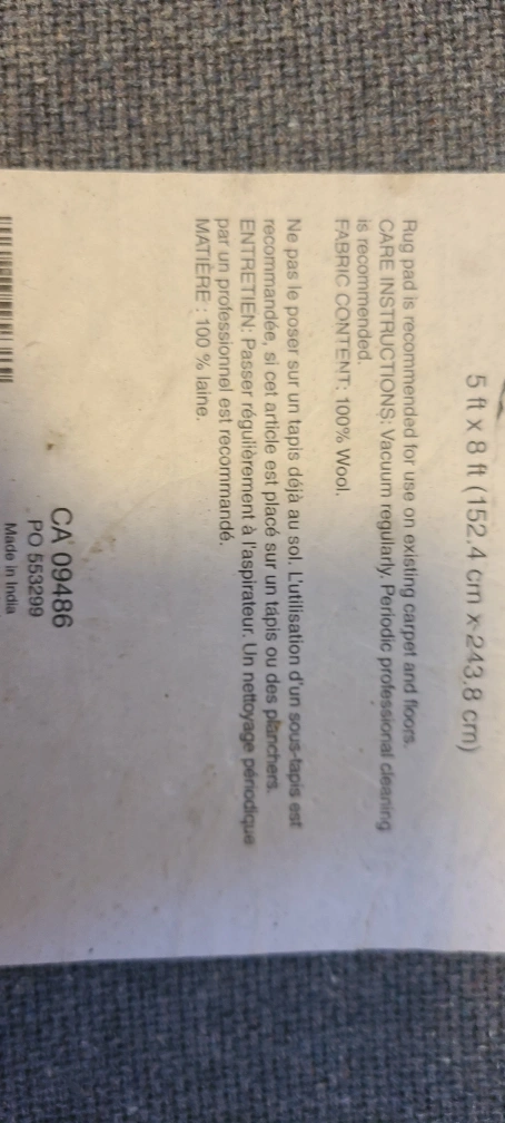 24Selling a rug that's 5 ft x 8 ft (152.4 cm x 243.8 cm). It's made of 100% wool. A rug pad is recommended for use on existing carpet and floors. For care, vacuum regularly; periodic professional cleaning is recommended