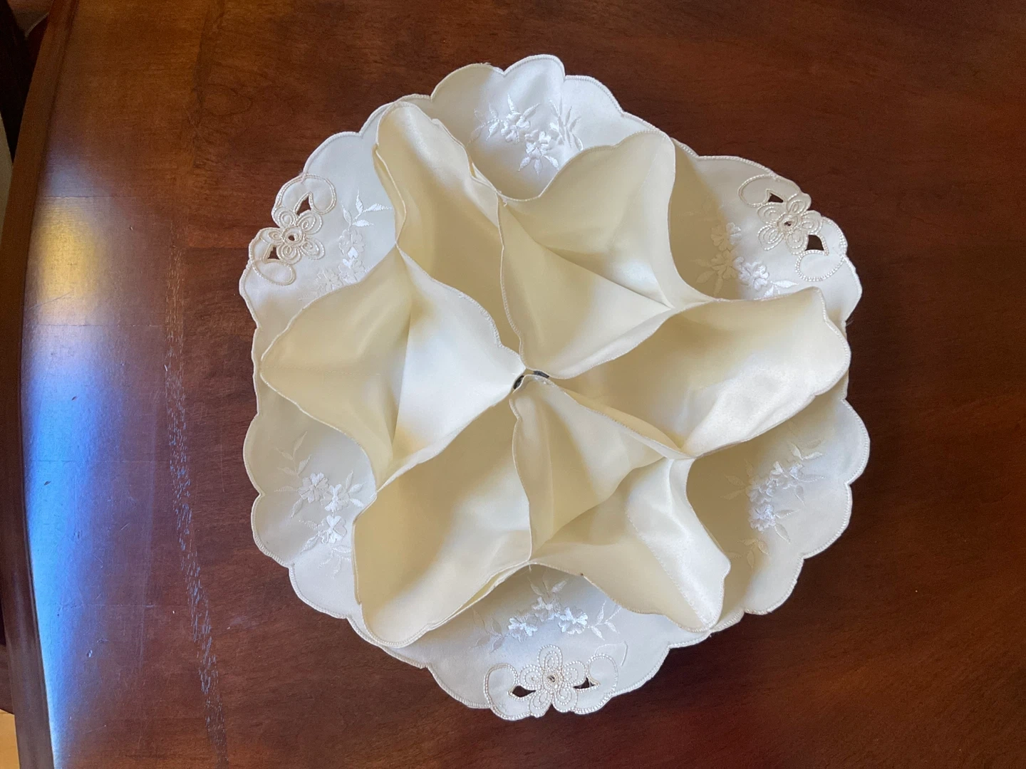 This is a brand new embroidered folding fabric bowl. It features a delicate floral embroidery pattern on a soft, cream-coloured fabric. Used normally for holding buns on your dining table. The bowl folds flat for easy storage when not in use. It's a unique and charming piece to add to your home decor!