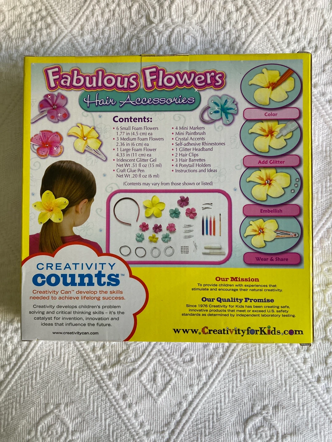 Get creative with this Creativity for Kids Fabulous Flowers Hair Accessories kit! Everything you need to create and decorate 10 hair accessories is included. It comes with: