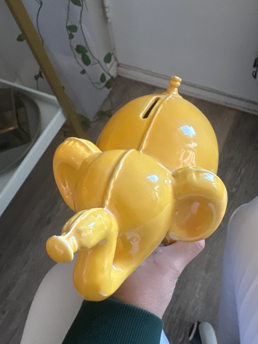 158Here's a cute yellow elephant coin bank! It's in great condition and ready to help you save your loonies and toonies. It's a fun and decorative way to keep your change organized