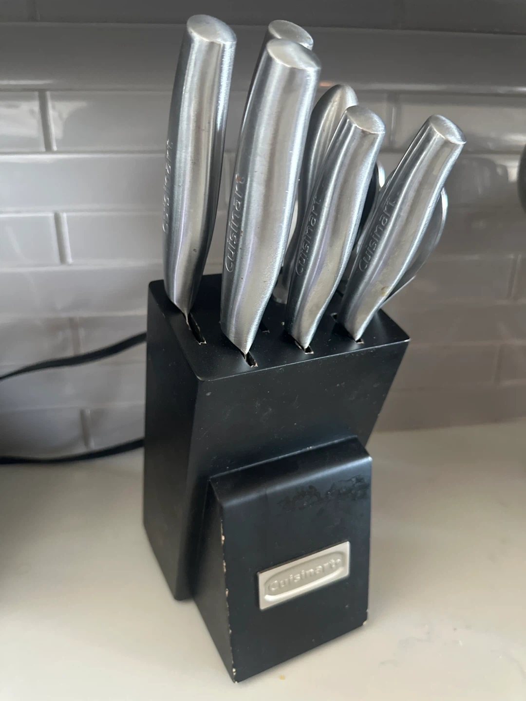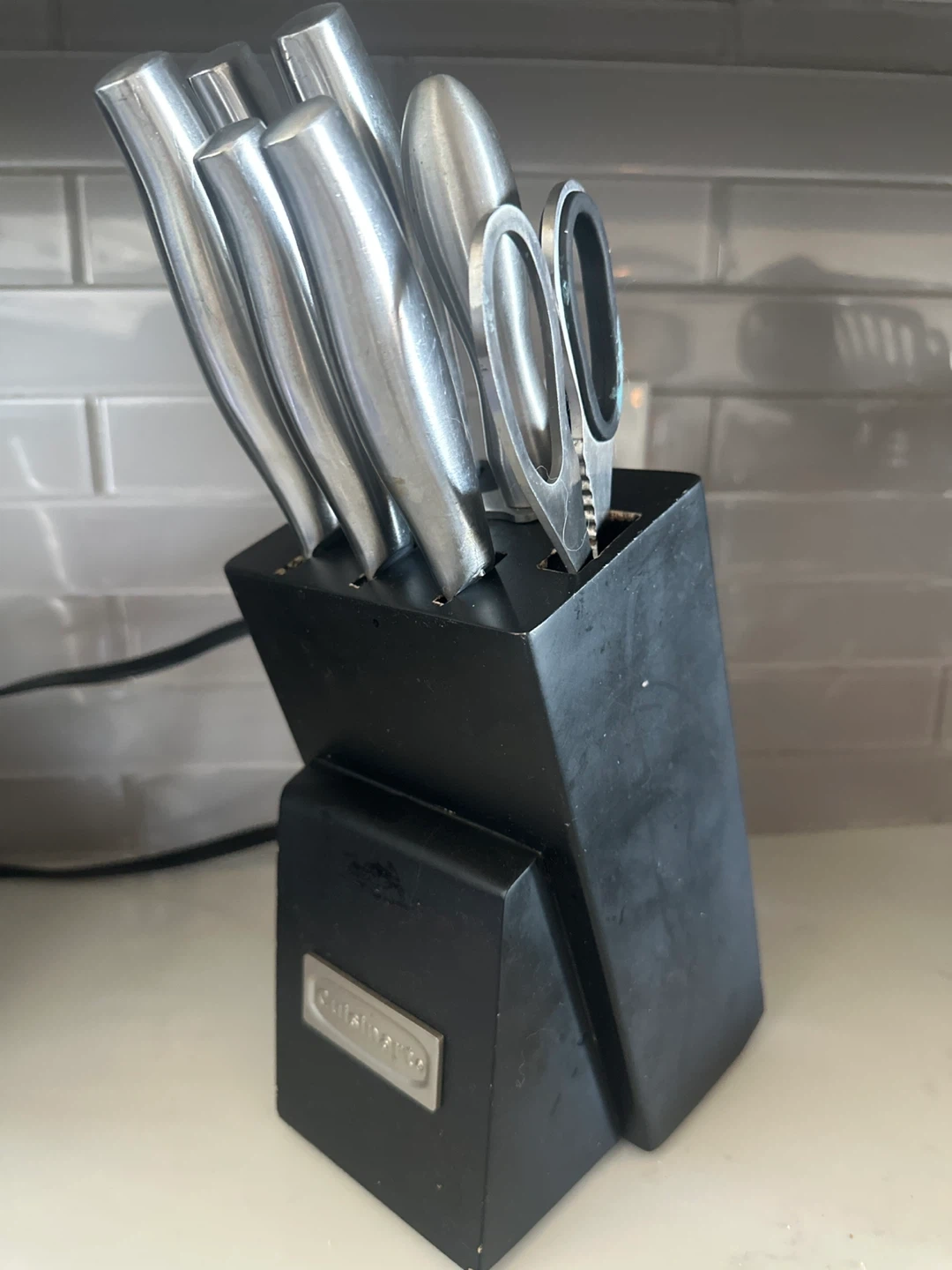158Selling a Cuisinart knife block set. It includes several knives and a pair of scissors. Perfect for any kitchen!