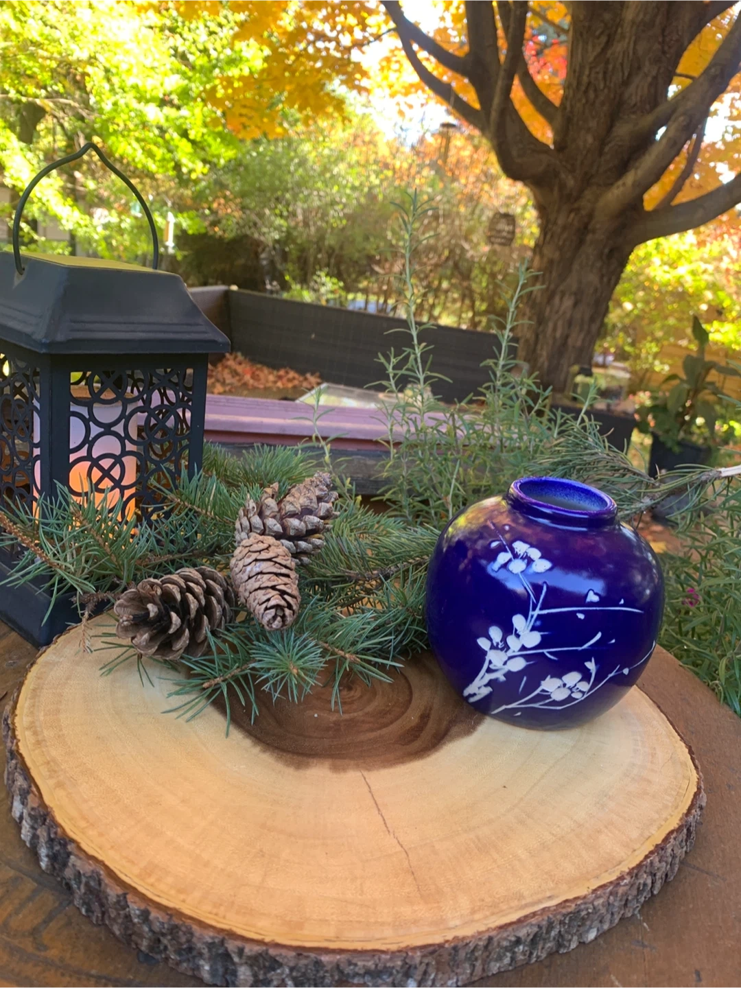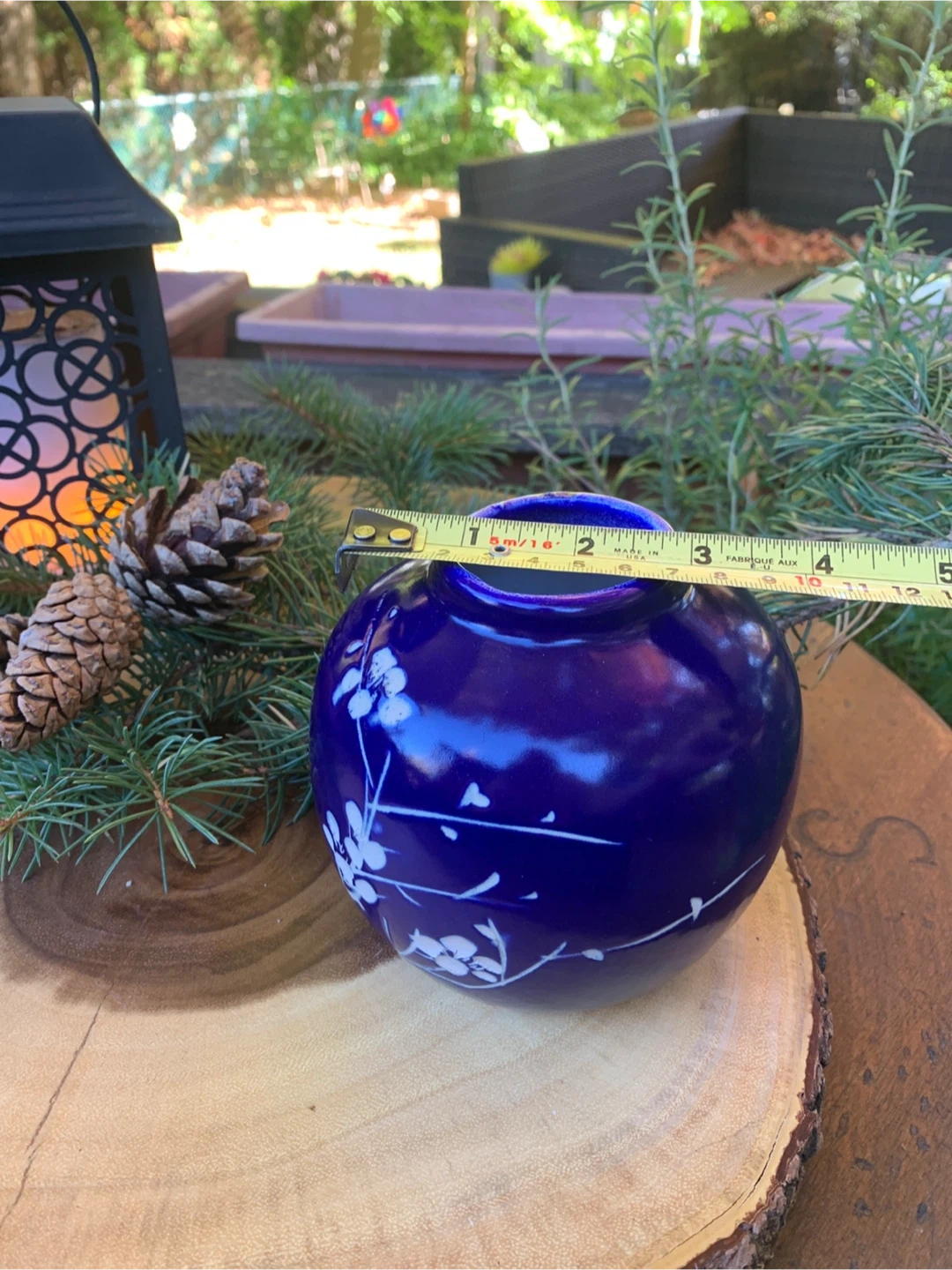 697Selling a lovely indigo blue ceramic vase with a delicate floral design on one side. I believe it could have been a ginger jar but has a missing lid. Still great for sitting on a book stack, coffee table or as a small bud vase! It's in great shape and would make a beautiful addition to any room. Perfect for displaying your favourite flowers! Cash only please. Props not included.