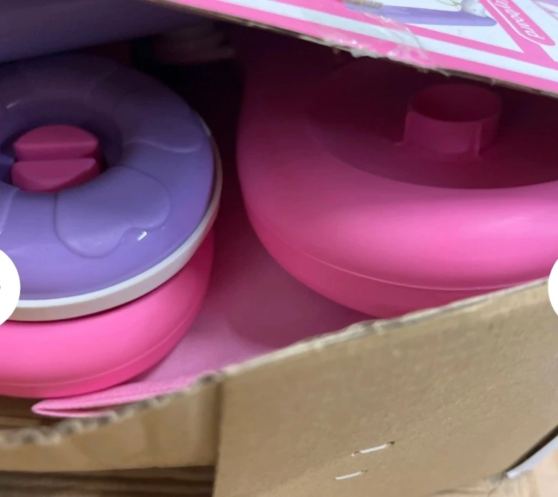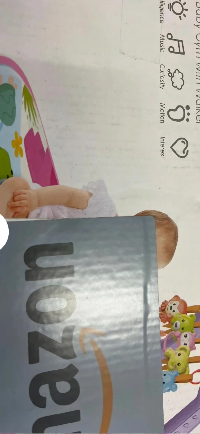 This is a 2-in-1 baby gym play mat! It has a piano keyboard, detachable rattles, adjustable handle, and a soft play mat. It's pink and purple and would be great for a baby!