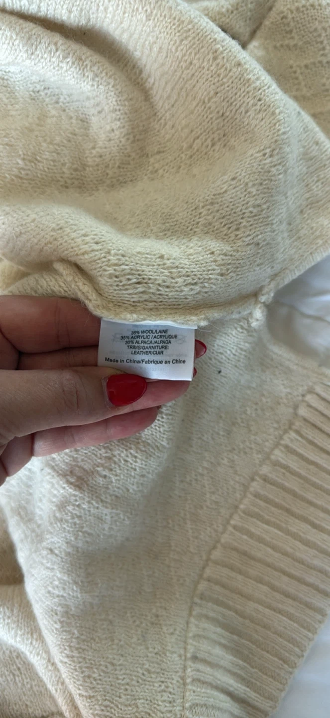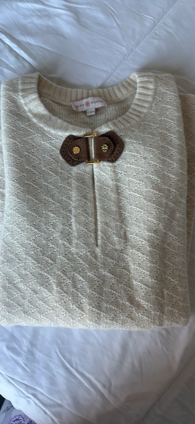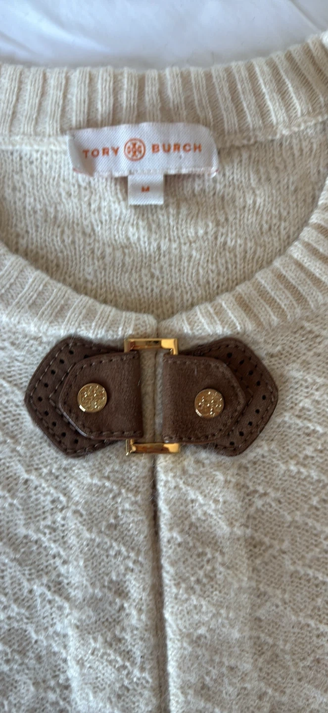 Cozy Tory Burch sweater in a size medium! It's a wool blend, perfect for staying warm and stylish. The unique toggle closure adds a touch of sophistication to this classic piece. Grab it before it's gone!