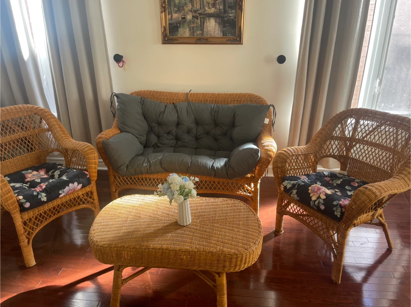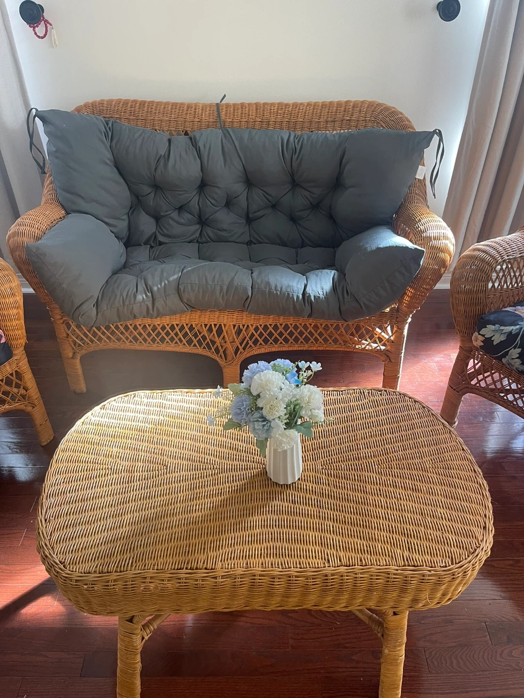 Selling a lovely wicker patio set that includes a loveseat, two chairs, and a coffee table. The cushions on the loveseat and chairs are in great shape. This set is perfect for enjoying the outdoors in comfort and style!