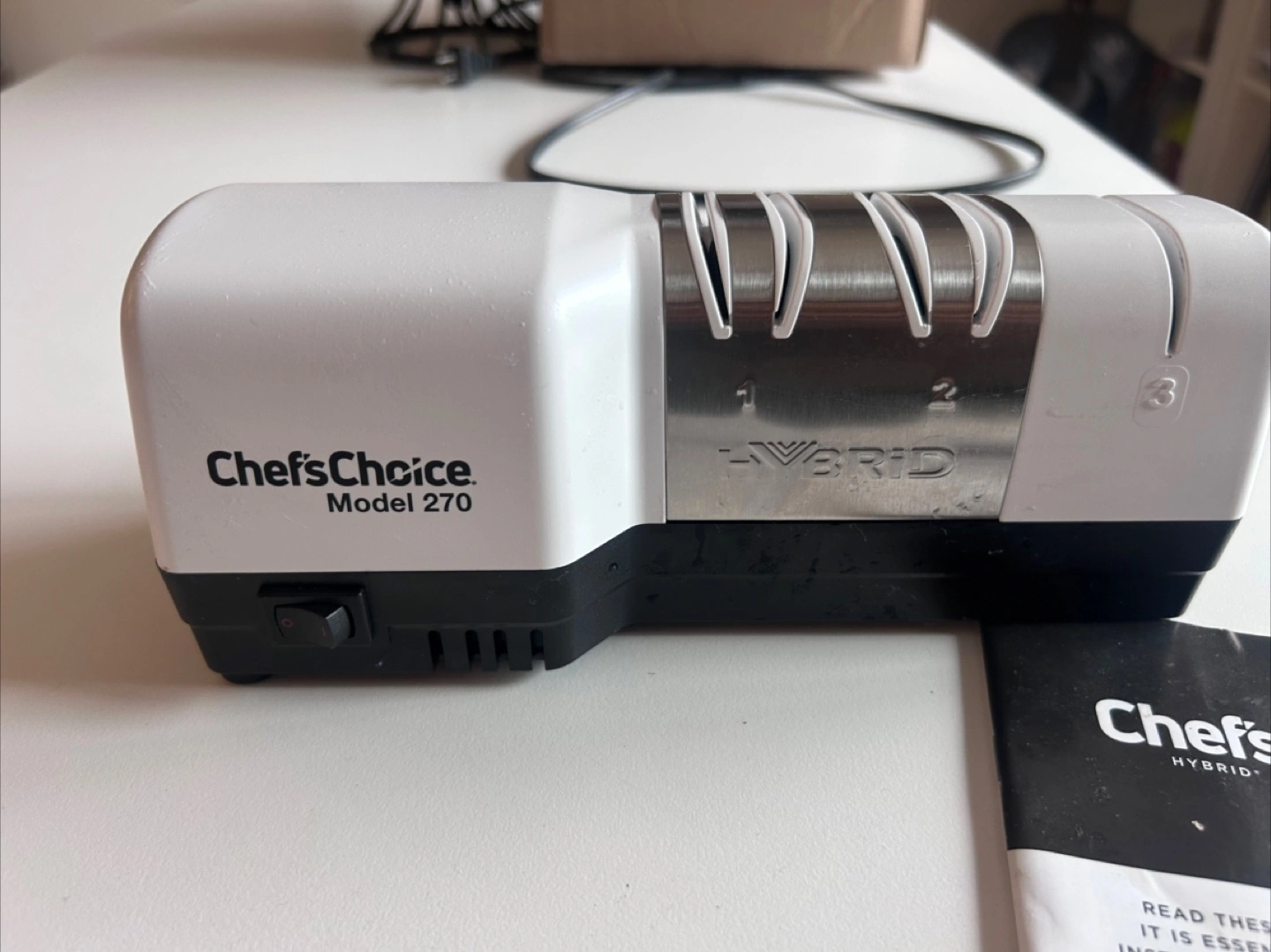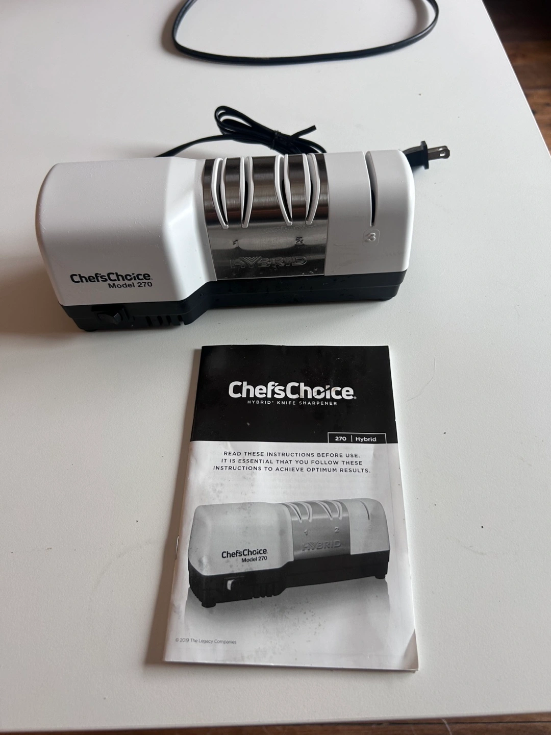 A Chef'sChoice knife sharpener, complete with its original manual. Features a sleek design with three sharpening stages. It is a great addition to any kitchen, allowing you to effortlessly maintain your knives' sharpness.