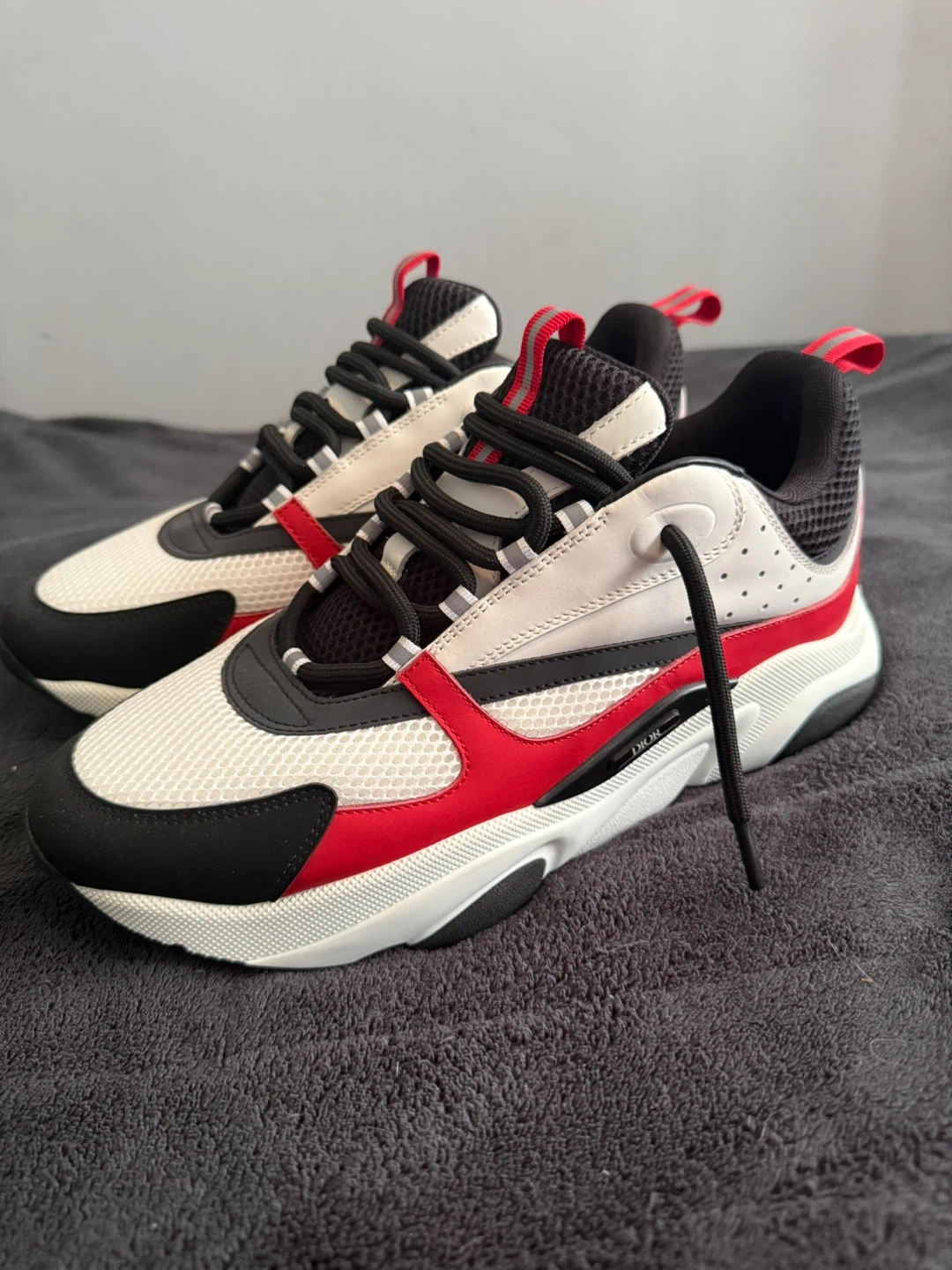 Selling a pair of Dior B22 sneakers in a striking white, red, and black colourway! These stylish sneakers feature a sporty design and are made in Italy. Perfect for adding a touch of luxury to your casual outfits!