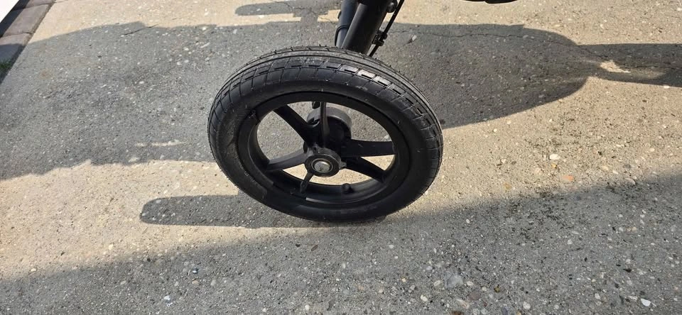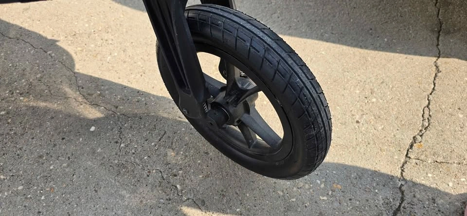 Features large "forever-air" rubber tires with all-wheel suspension, one-hand fold, adjustable handlebar, and hand-operated parking brake.