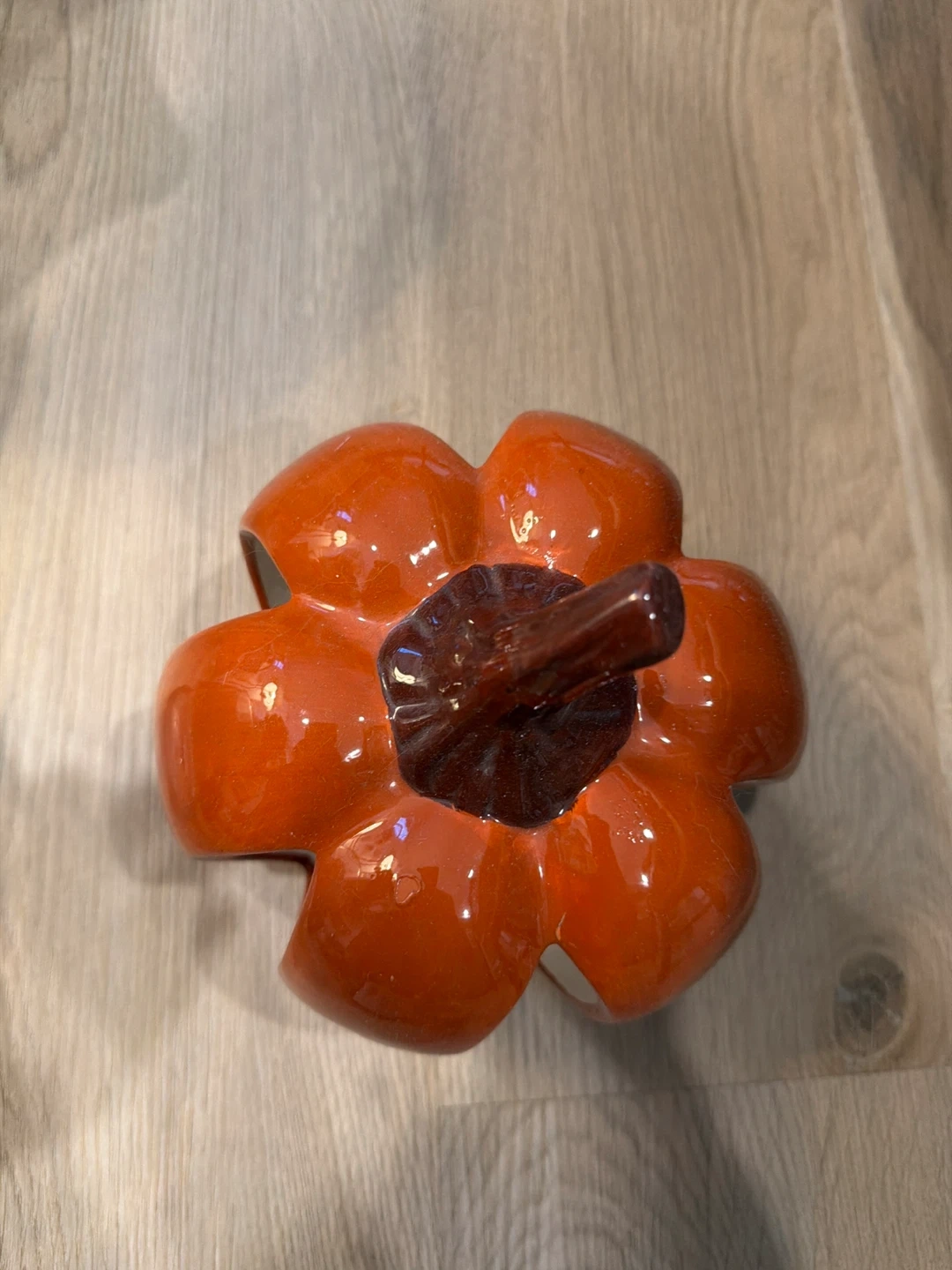 15A festive ceramic pumpkin candle holder, perfect for adding a touch of autumn to your home! It features a glossy orange finish and openings for the warm light to shine through. The holder uses a battery-powered LED light instead of a real candle, making it a safe and charming decoration for Halloween or Thanksgiving.