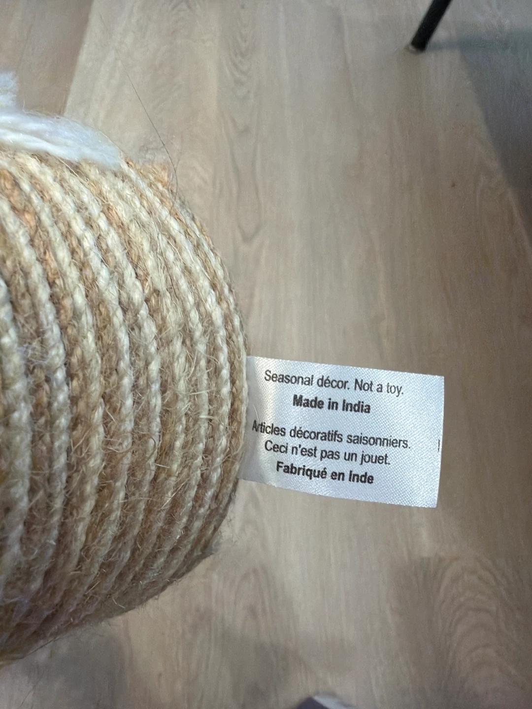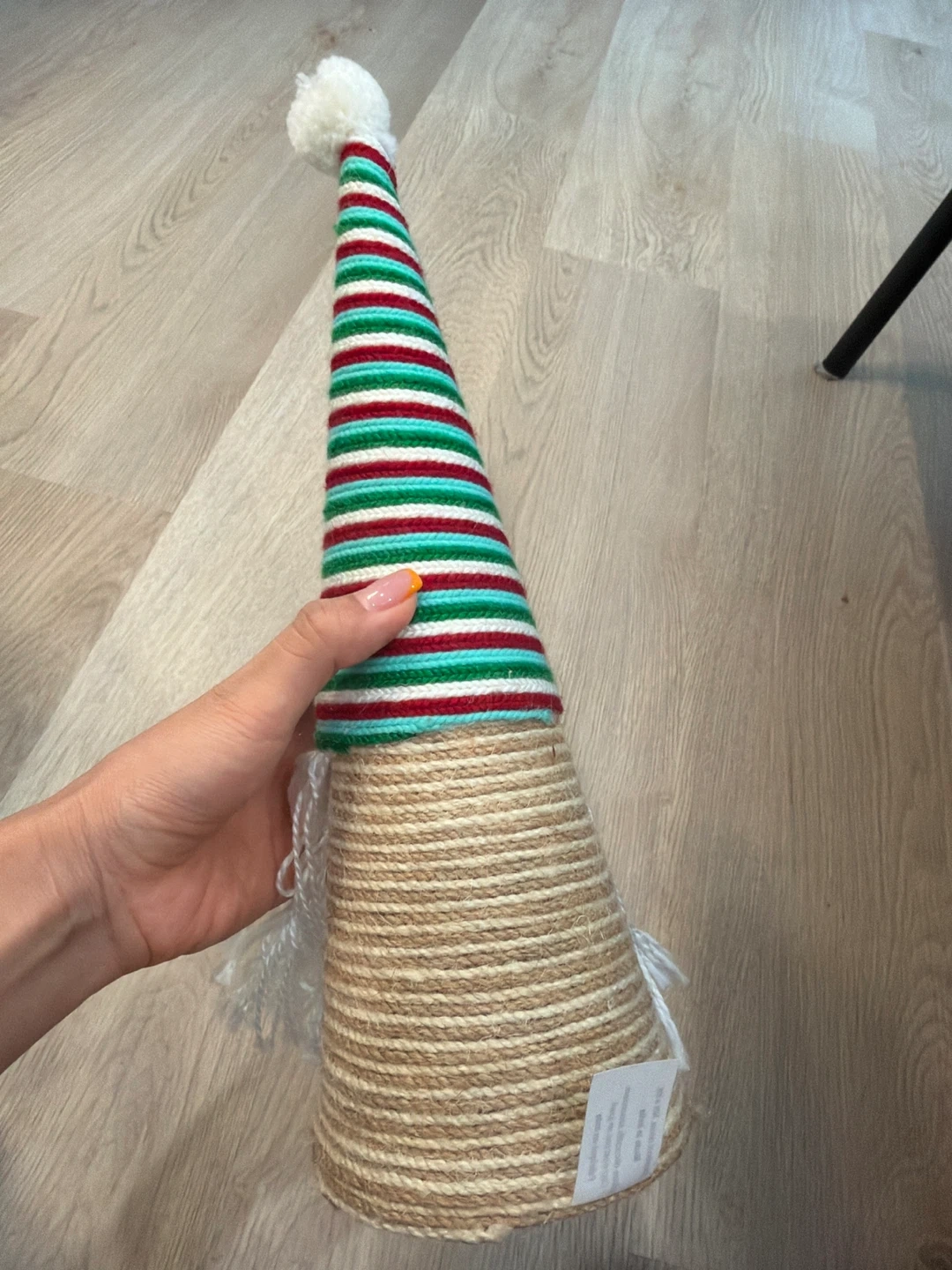 This is a cute seasonal gnome decor item. It's made in India and has a striped hat with a white beard. Please note that it's not a toy, but a decorative item for the season