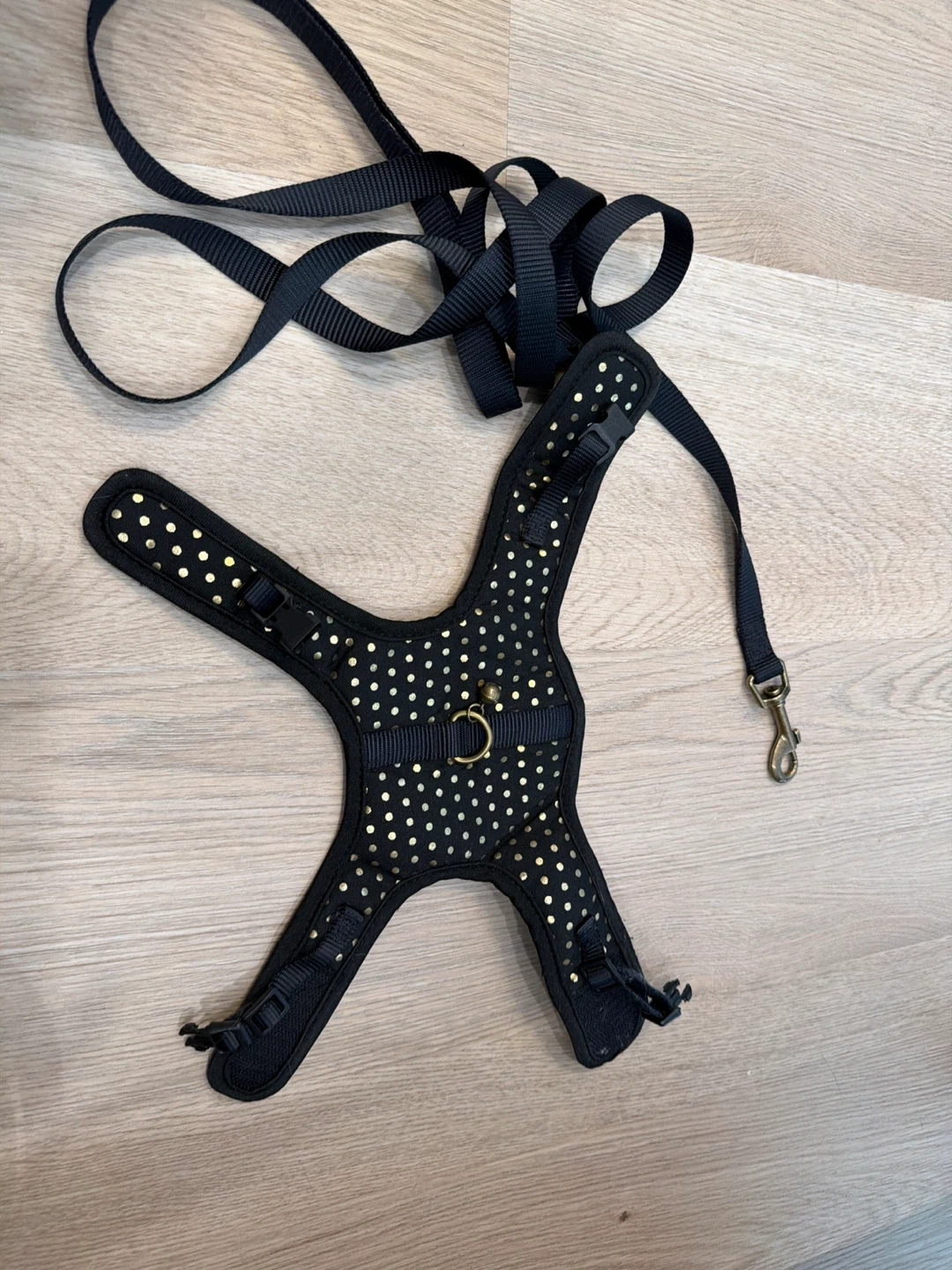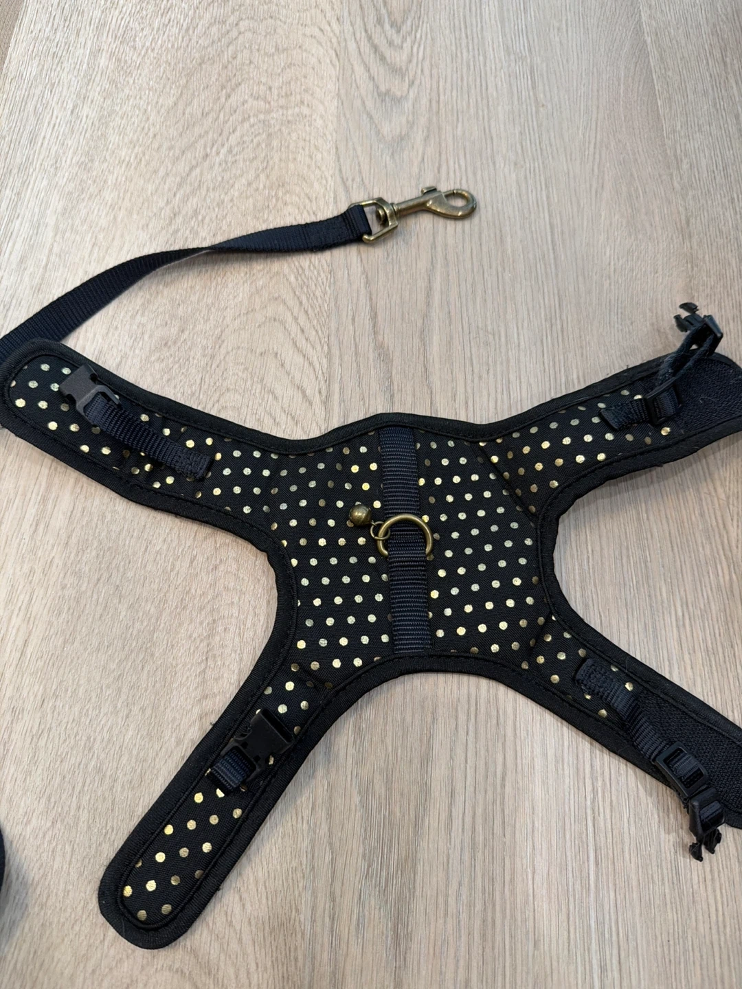15Selling a gently used dog harness! It's black with cute gold dots and comes with a leash. Perfect for small to medium-sized cats