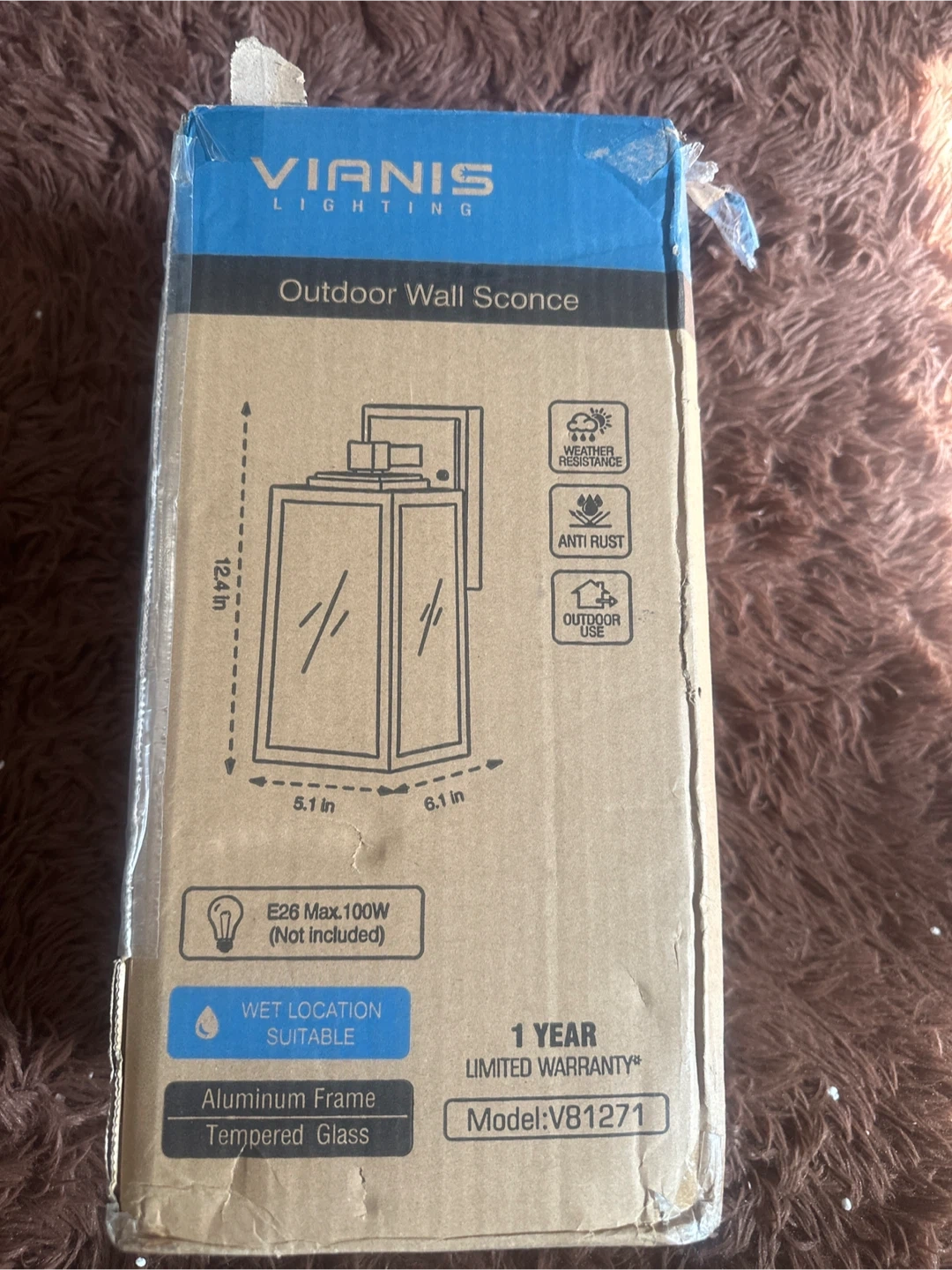 10Selling a brand new Vianis Lighting outdoor wall sconce, still in its original box! It's a stylish addition to any outdoor space. Key features: - UV-resistant - Anti-rust - Suitable for wet locations - Aluminum frame with tempered glass - Requires 1 x E26 bulb (not included) - Model: V81271 Dimensions: 12.4 in x 5.1 in x 6.1 in