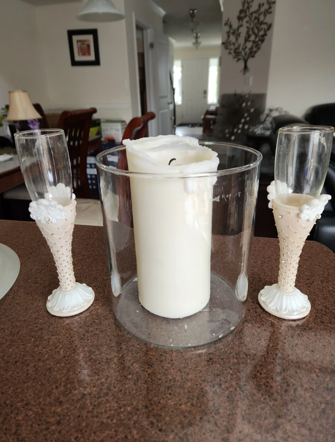 Selling a candle in a glass vase, along with two decorative glasses. They're in good condition and would look great as a centrepiece or accent pieces in your home!