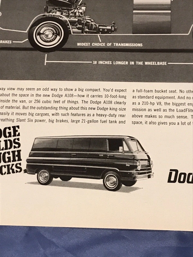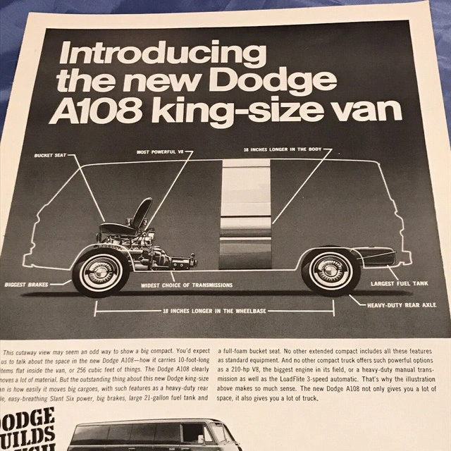 10Original ad for a 1967 Dodge A108 Van. Size: 10-1/4" X 13-1/2". More info: Art. Feel free to message if you have any questions!