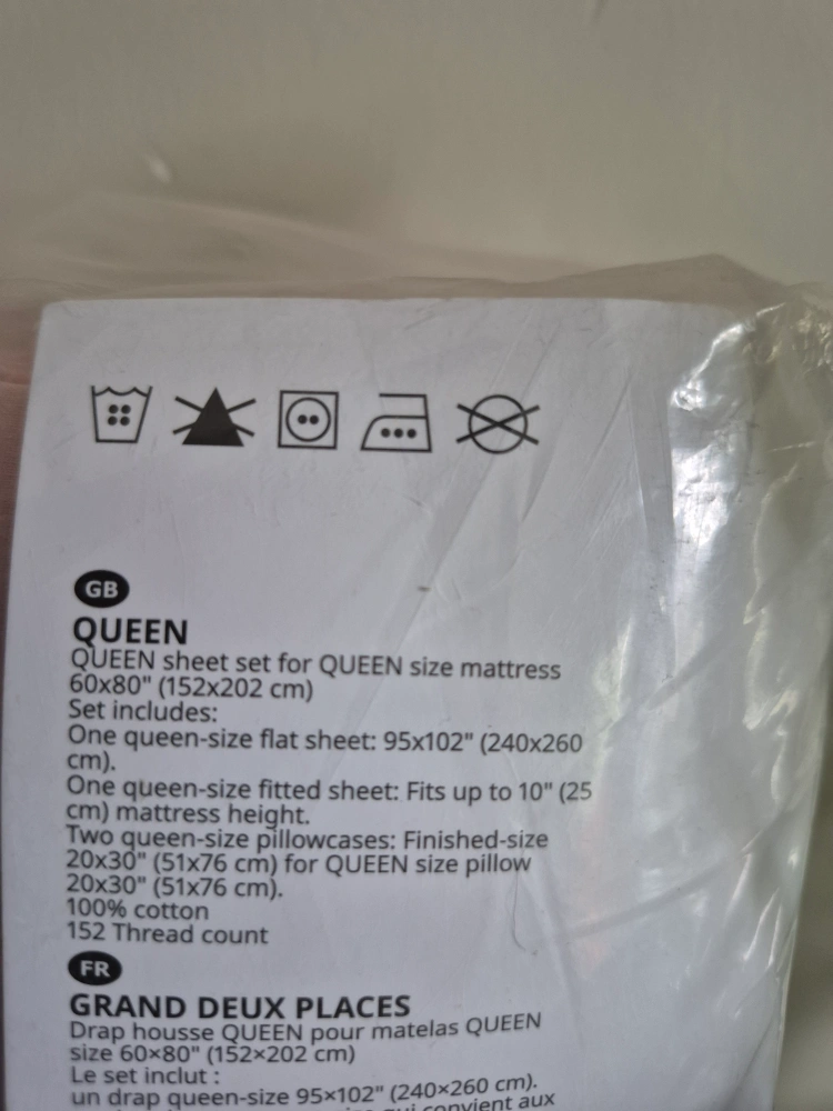 Brand new in packaging, a Dvala queen size sheet set! The set includes one queen-size flat sheet (95x102 inches), one queen-size fitted sheet (fits up to 10 inch mattress height), and two queen-size pillowcases (20x30 inches). Made of 100% cotton with a 152 thread count. Asking $20. Pick up location 333 Taralake Way NE also able to meet in downtown some weekdays at 731 6 Avenue SW.