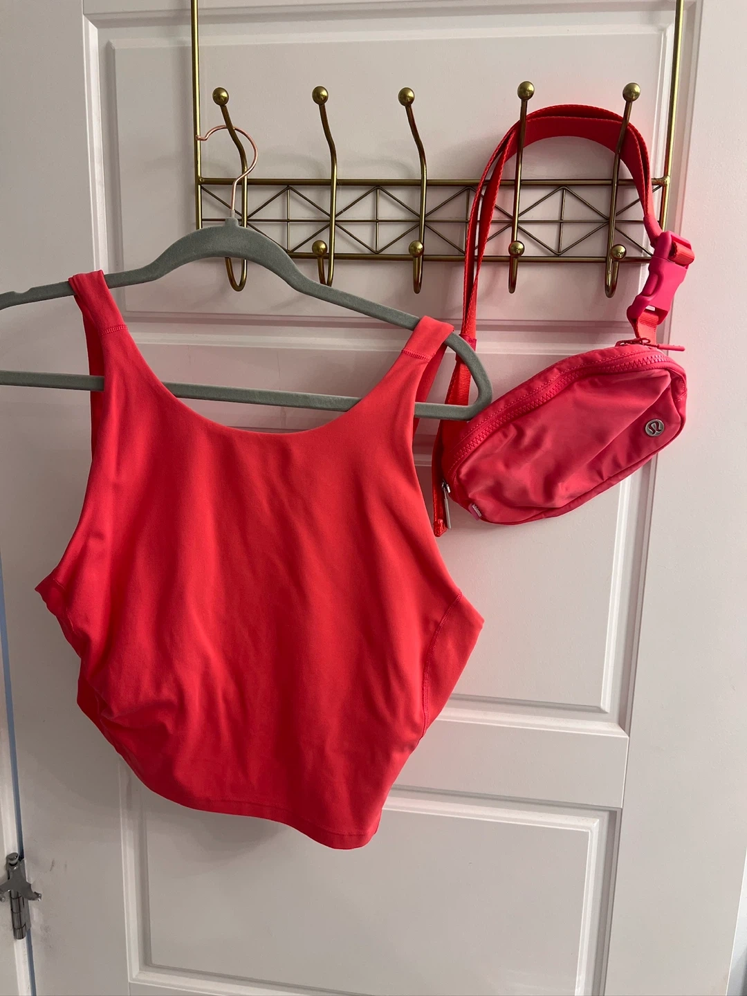 Selling a cute Lululemon set! It includes a top and a belt bag, both in a vibrant pink colour. Perfect for workouts or casual wear