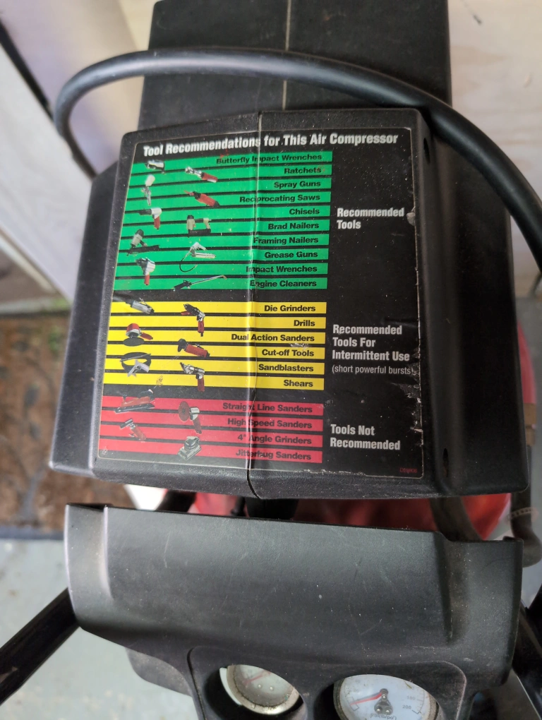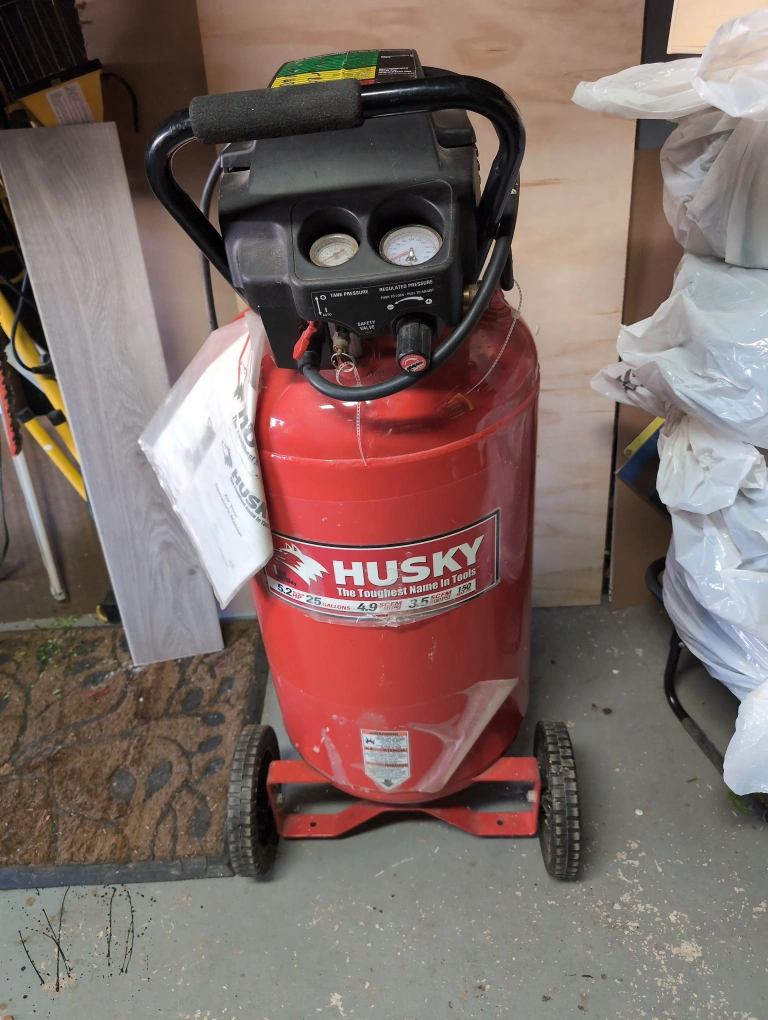 28Selling a Husky air compressor. It's a 6.2 HP, 25-gallon model. The label indicates it delivers 4.9 CFM @ 40 PSI and 3.5 SCFM @ 90 PSI. It's designed with a maintenance-free, oil-less pump and easy-to-operate controls with descriptive icons