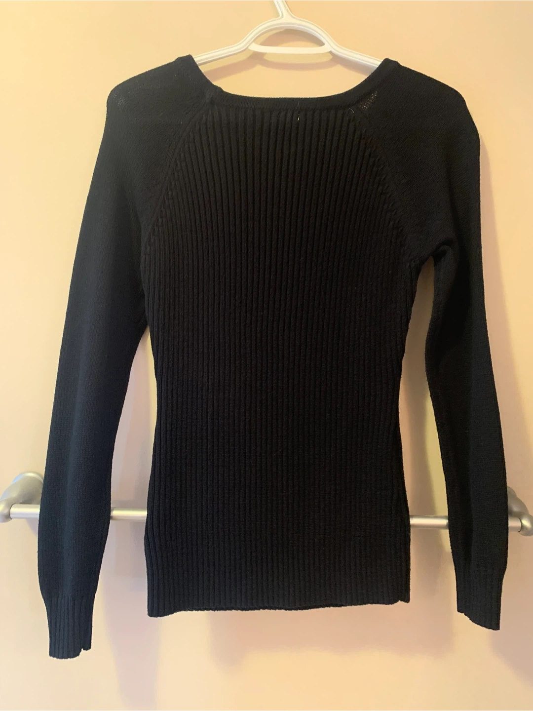 This is a Guess long sleeve ribbed top in black. It has gold buttons on the shoulder. It's in great condition and ready for a new home!