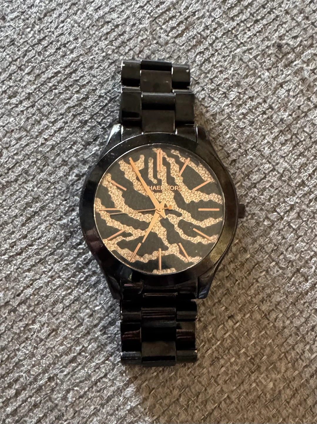 Selling a stylish Michael Kors watch! It features a unique patterned face and a sleek black band. Perfect for adding a touch of elegance to any outfit