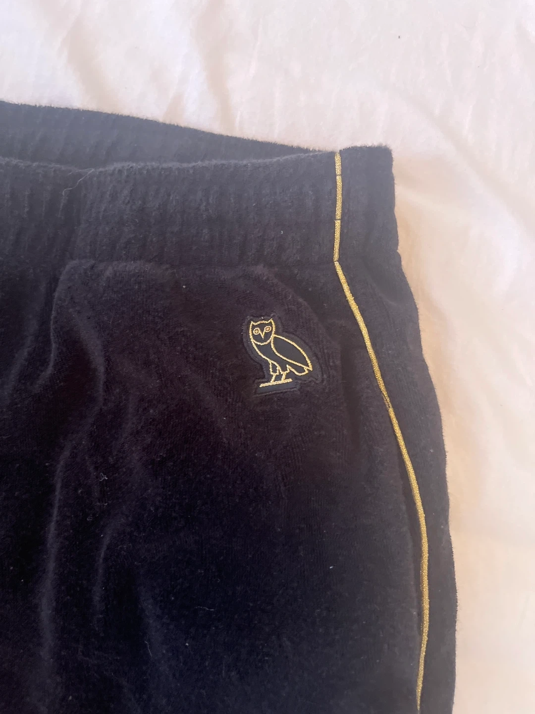 10Selling a pair of OVO velour track pants in black with gold accents! These are super comfy and stylish. The OVO owl logo is embroidered on the hip. Perfect for lounging or a casual outing!